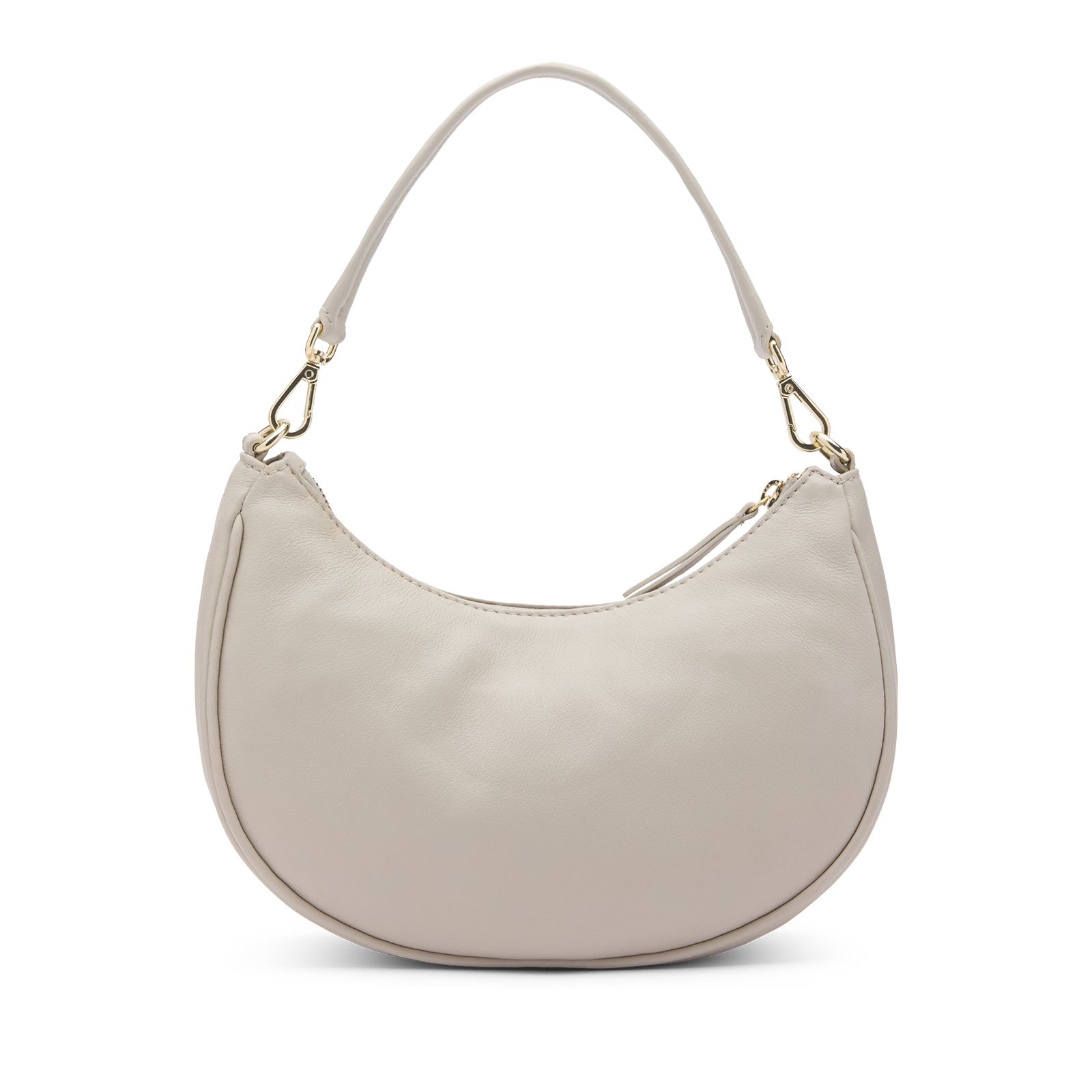 Beige leren handtas van Manfield. De tas heeft gouden details, een verstelbare band van 123 cm, ritssluiting en een zijvak in de binnenzijde van de tas. De tas heeft een afmeting van 27x20x9 cm (BxHxD) en kan zowel als schoudertas als handtas gedragen worden.