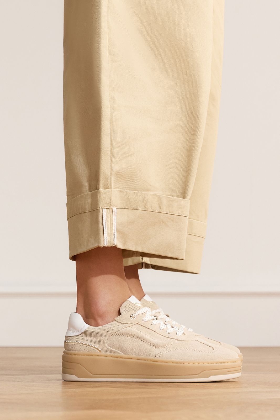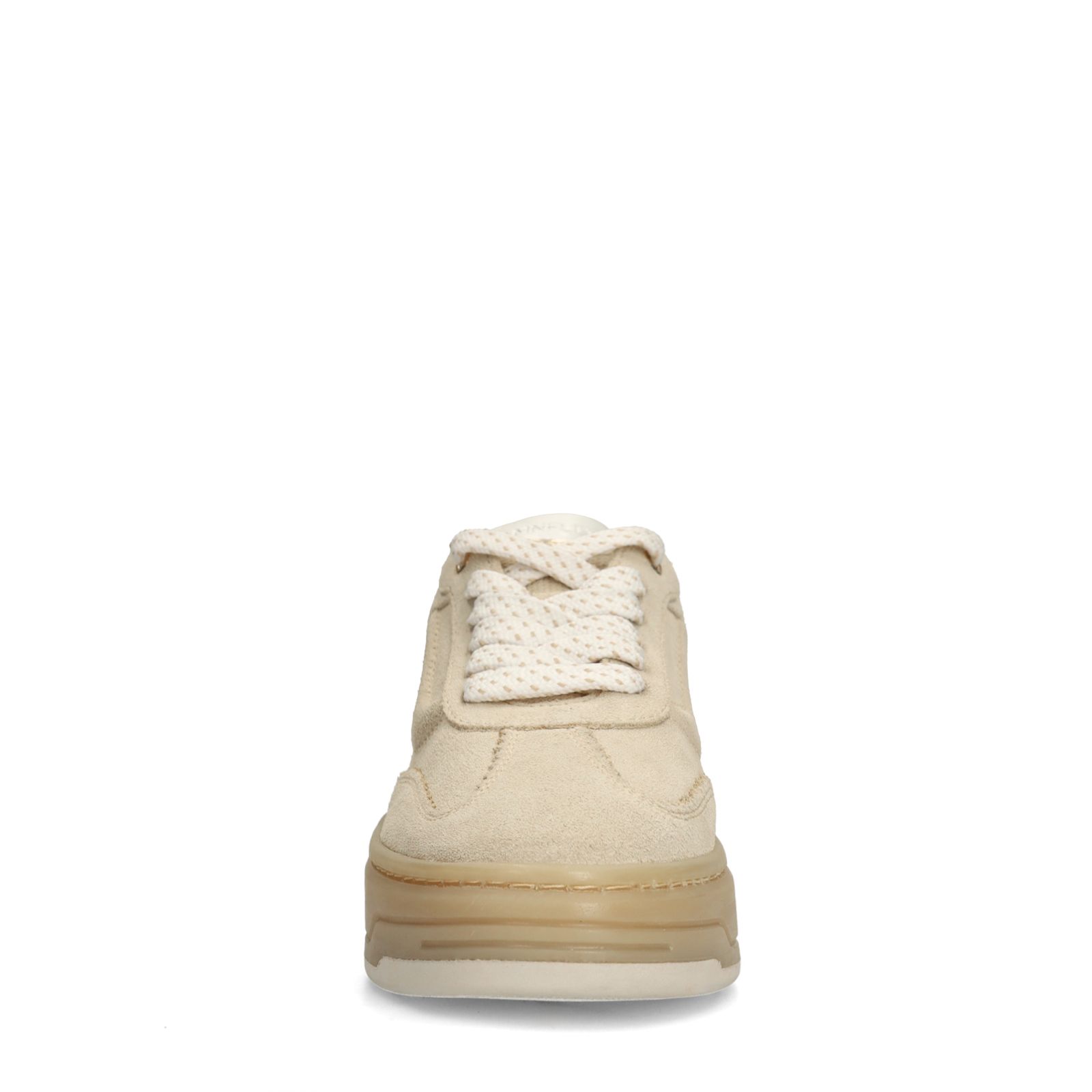 Beige leren sneakers van Manfield. De sneakers hebben een dikke zool van 5 cm en een wit detail op de hak. We adviseren als bescherming en verzorging de Collonil Carbon pro.