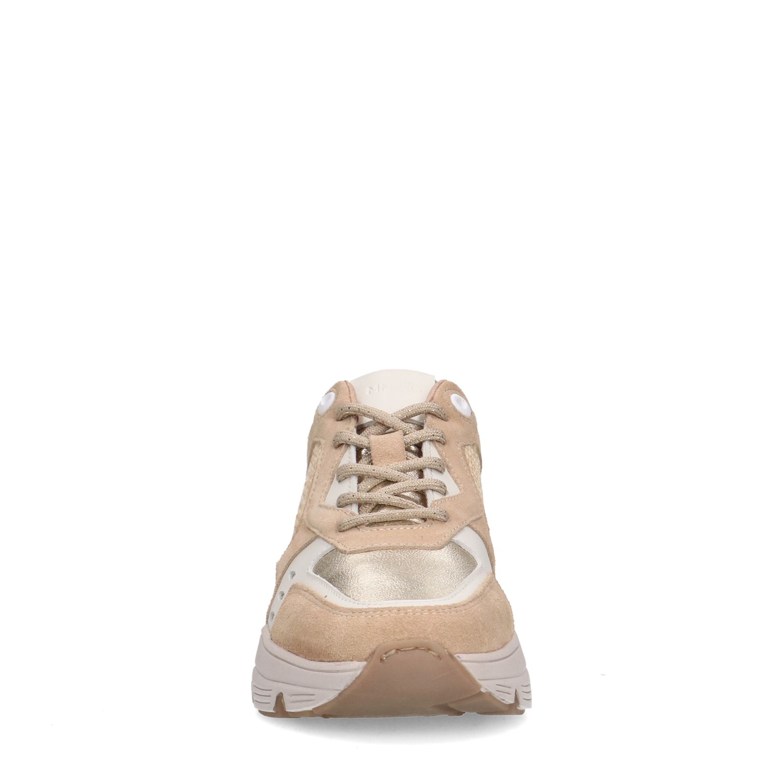 Beige leren sneakers met geweven detail van Manfield. De sneakers hebben een zool van 3 cm. We adviseren als verzorging en bescherming de Collonil Carbon Pro.