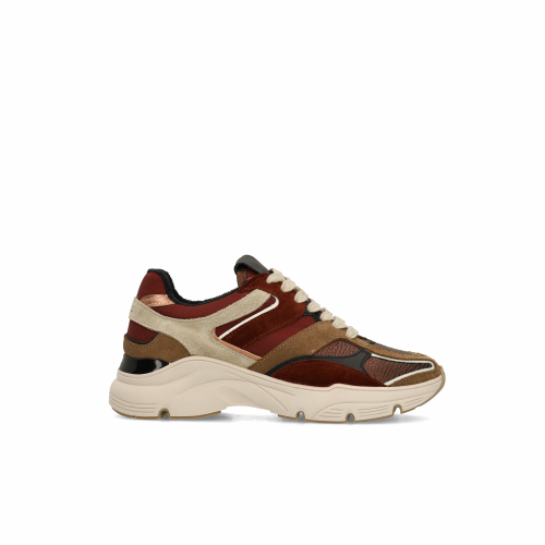 Beige leren sneakers met donkere multicolor details van Manfield. De sneakers hebben een beige zool van 3 cm. We adviseren als bescherming en verzorging de Collonil Carbon pro.
