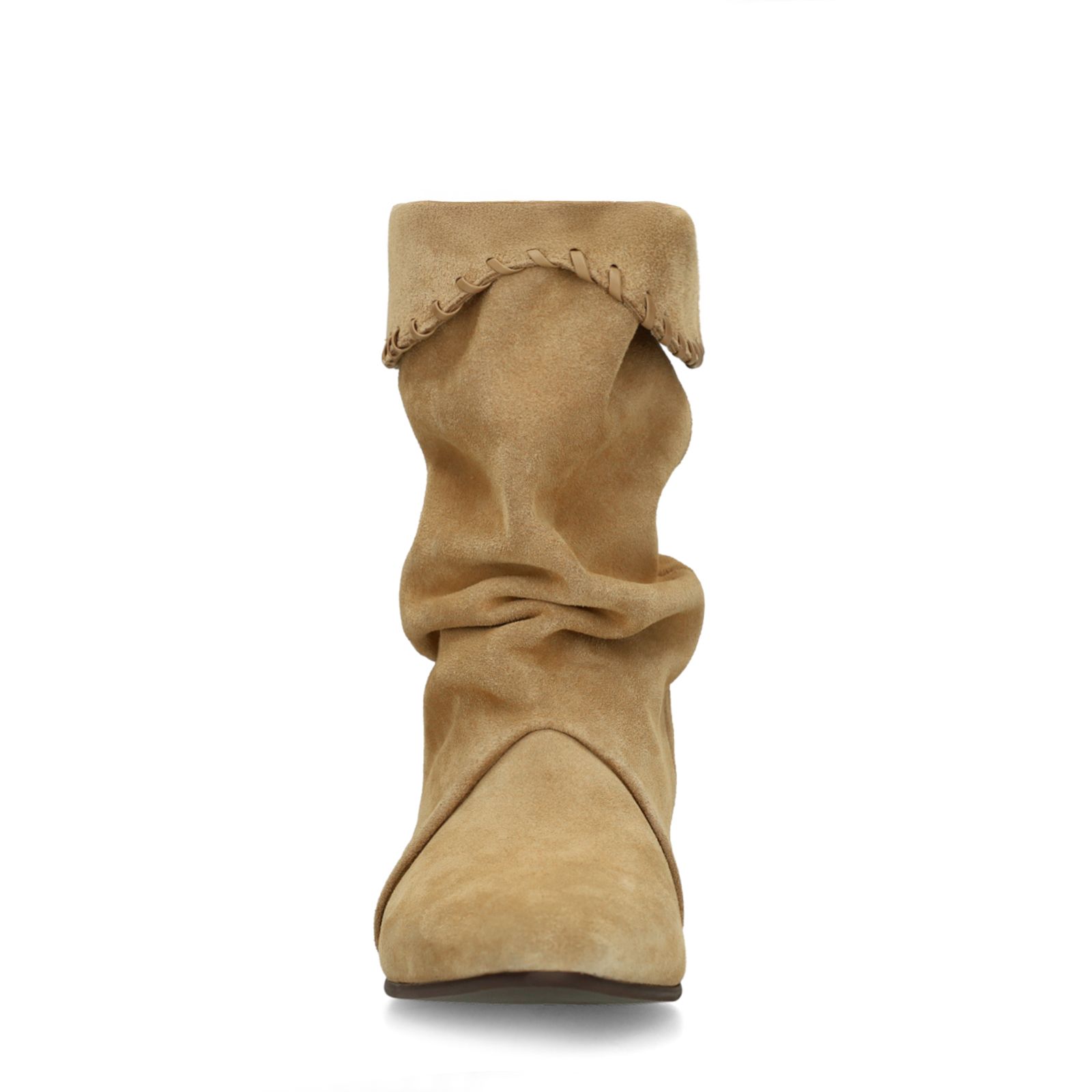 Beige suède enkellaarsjes van Manfield met een platte hak van 3 cm. De enkellaarsjes hebben een puntige neus en een afzak effect. De laarzen hebben een schachthoogte van 23 cm en een schachtomtrek van 40 cm, gemeten bij een maat 37. We adviseren als bescherming en verzorging de suède/ nubuck spray in transparant.