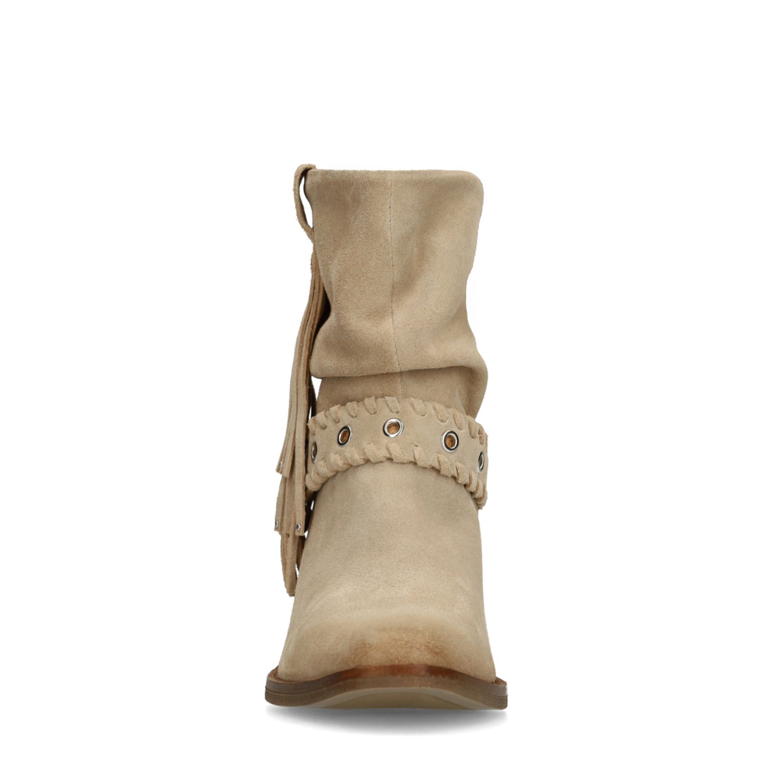 Beige suède enkellaarsjes met franjes van Manfield. De enkellaarsjes hebben een blokhak van 6 cm, puntige neus en een gesp detail en zijn voorzien van een ritssluiting aan de binnenzijde. De schachthoogte is 16 cm en de schachtomtrek is35 cm, gemeten bij een maat 37. We adviseren als bescherming en verzorging de suède/ nubuck spray in transparant.