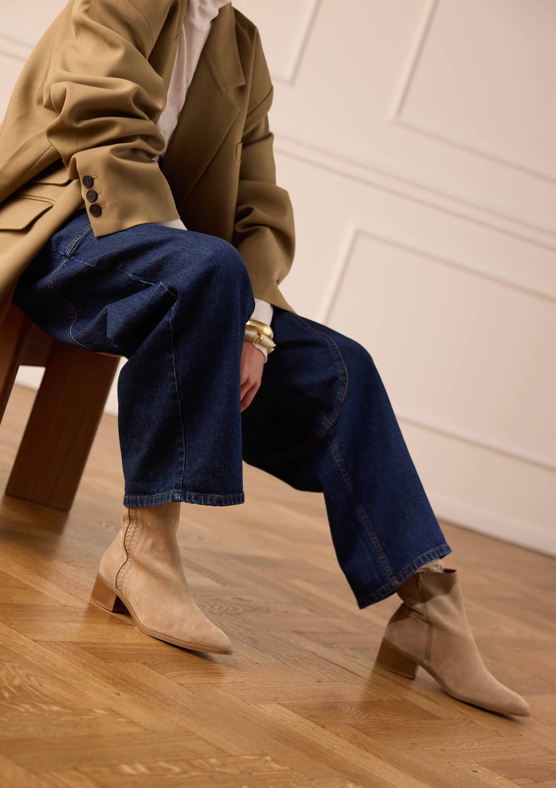 Beige suède enkellaarsjes met hak van Manfield met gevlochten details. De laarsjes hebben een blokhak van 4 cm, puntige neus en een rits aan de binnenzijde. We adviseren als verzorging en bescherming de suède/nubuck spray in transparant.