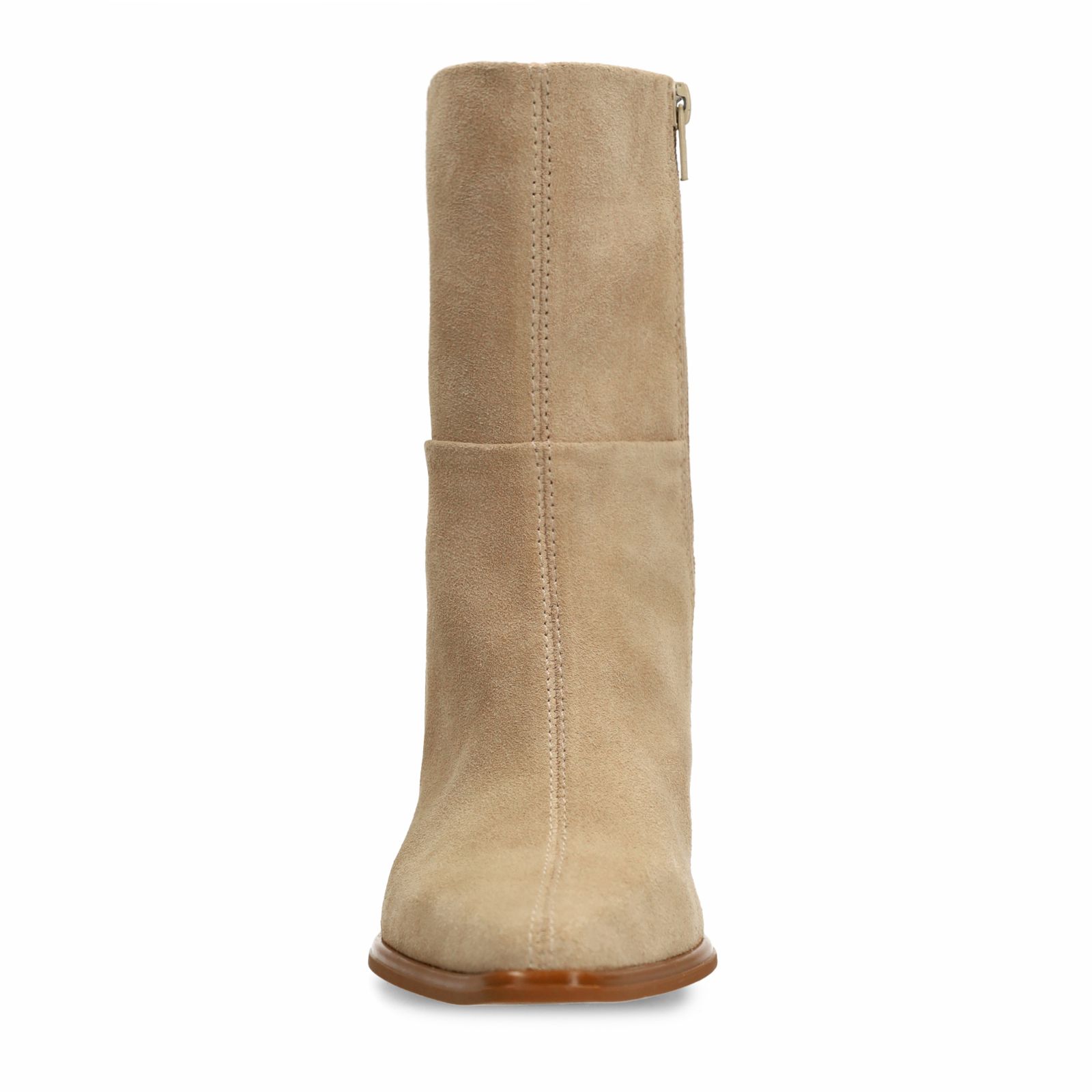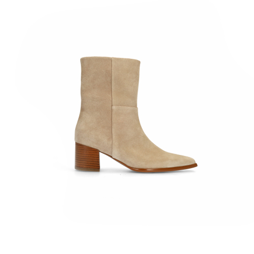 LET OP - Dit artikel is een pre order, de verwachte levertijd is eind december. Beige suède enkellaarsjes met hak van Manfield. De laarsjes hebben een puntige neus, cognac houten blokhak van 5 cm en ritssluiting aan de binnenzijde. We adviseren als verzorging en bescherming de Collonil Carbon Pro.