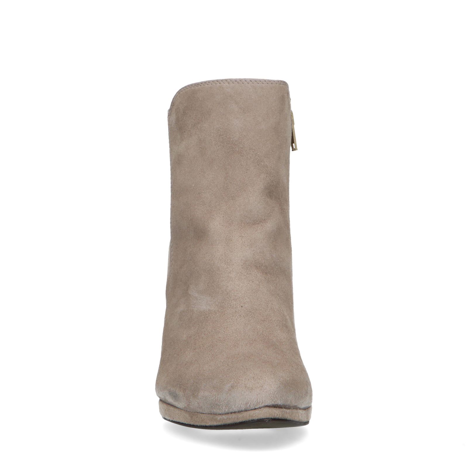 Beige suède enkellaarsjes met hak van Manfield. De laarsjes hebben een hak van 8 cm en ritssluiting aan de binnenzijde. We adviseren als verzorging en bescherming de suède/nubuck spray in transparant.