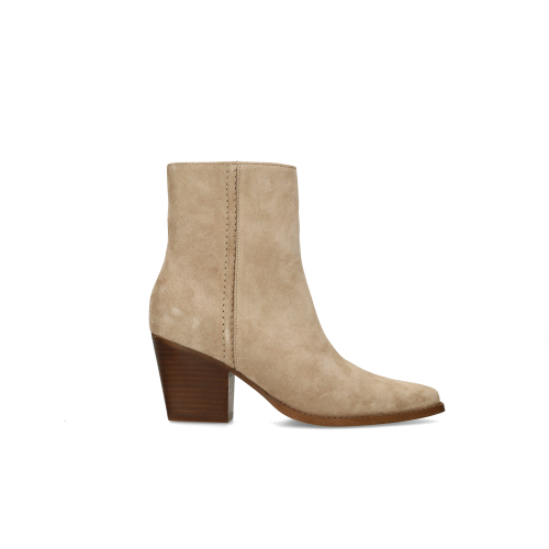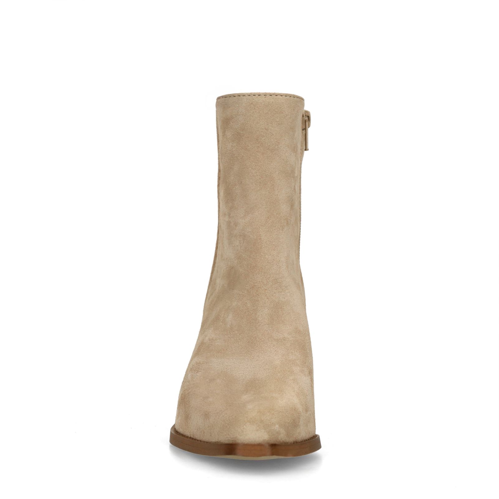 Beige suède enkellaarsjes met hak van Manfield. De laarsjes hebben een blokhak van 8 cm, puntige neus en rits aan de binnenzijde. We adviseren als verz