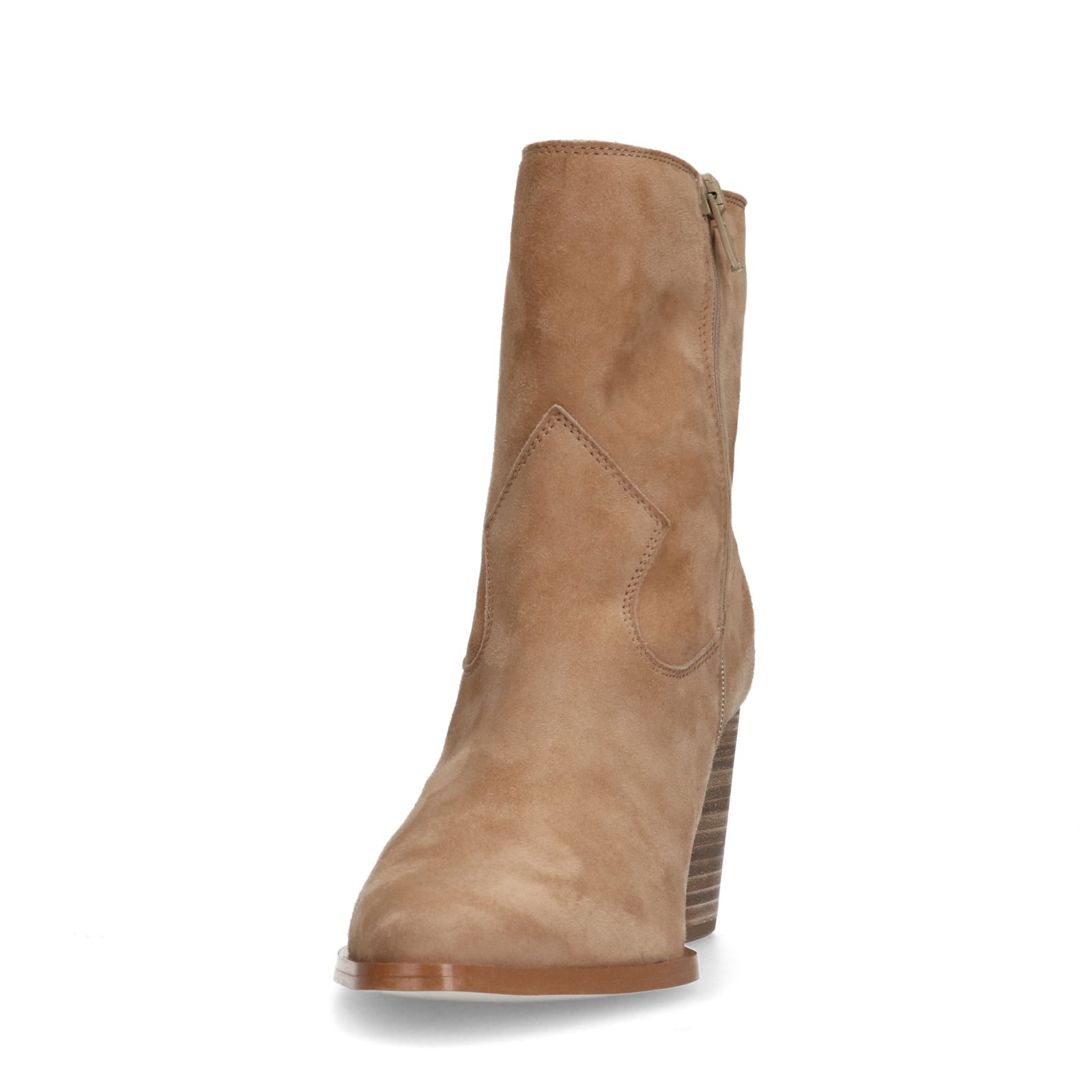 Beige suède laarsjes van Manfield met schuin afgesneden blokhak van 7 cm. De laarzen hebben een puntige neus en ritssluiting aan de binnenzijde. We adviseren als verzorging en bescherming suède/nubuck spray in transparant.