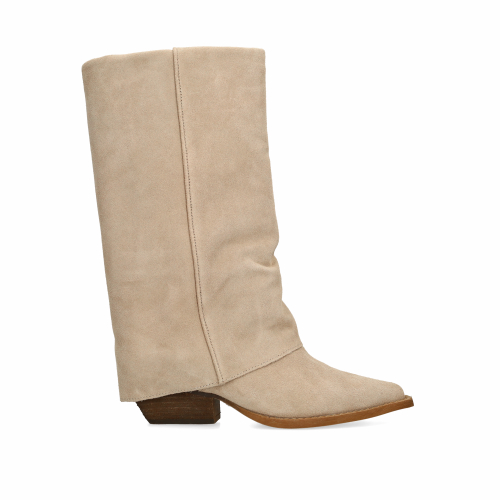 Beige suède laarzen met flap van Manfield. De laarzen hebben een puntige neus en een hakhoogte van 5 cm. De schachthoogte is 29 cm en de schachtbreedte van 40 cm, gemeten bij een maat 37. We adviseren als verzorging en bescherming de suède/nubuck spray in transparant.
