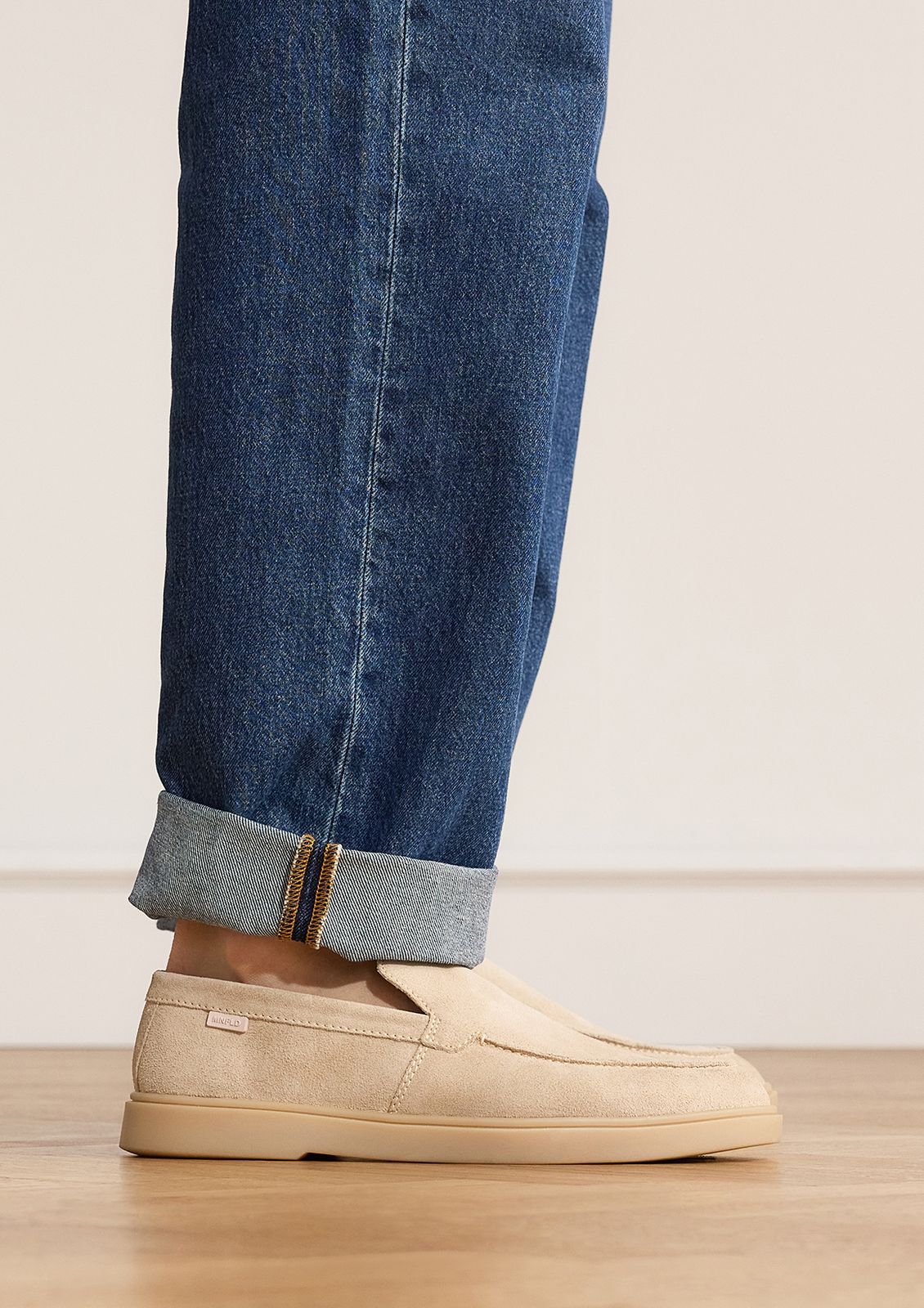 Beige suède loafers van Manfield met een lichte zool van 3 cm. We adviseren als verzorging en bescherming suède/nubuck spray in transparant.