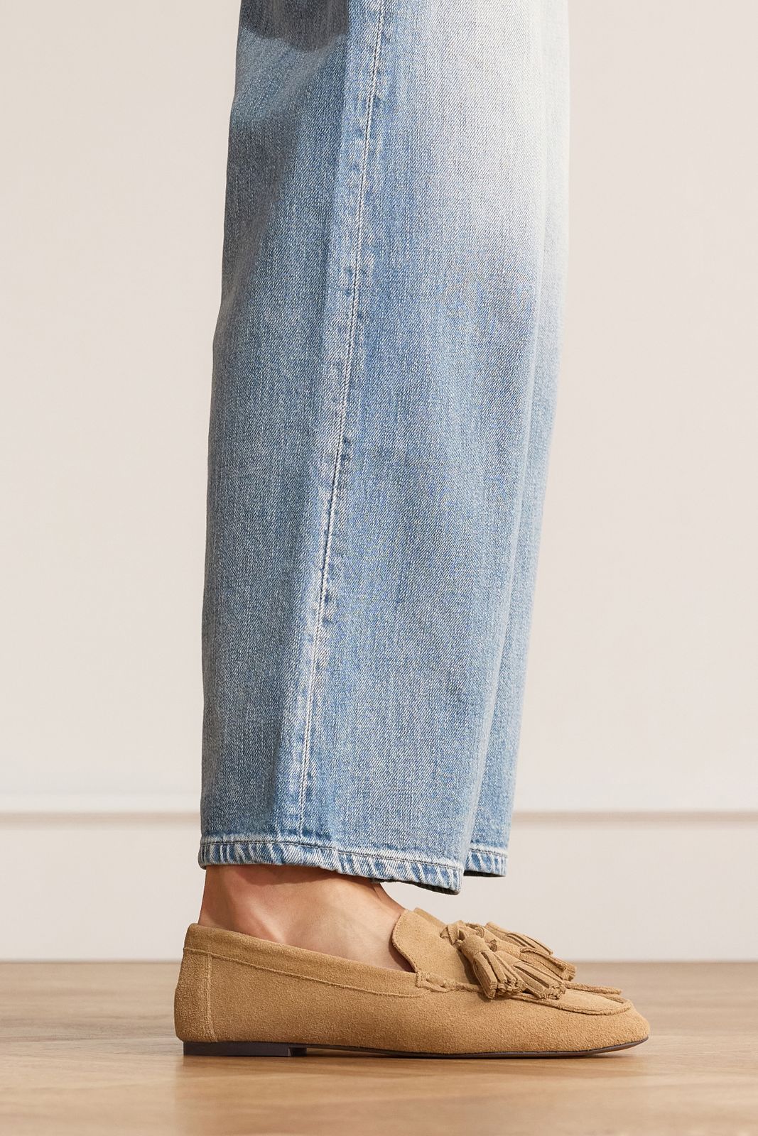 Beige suède loafers met franjes