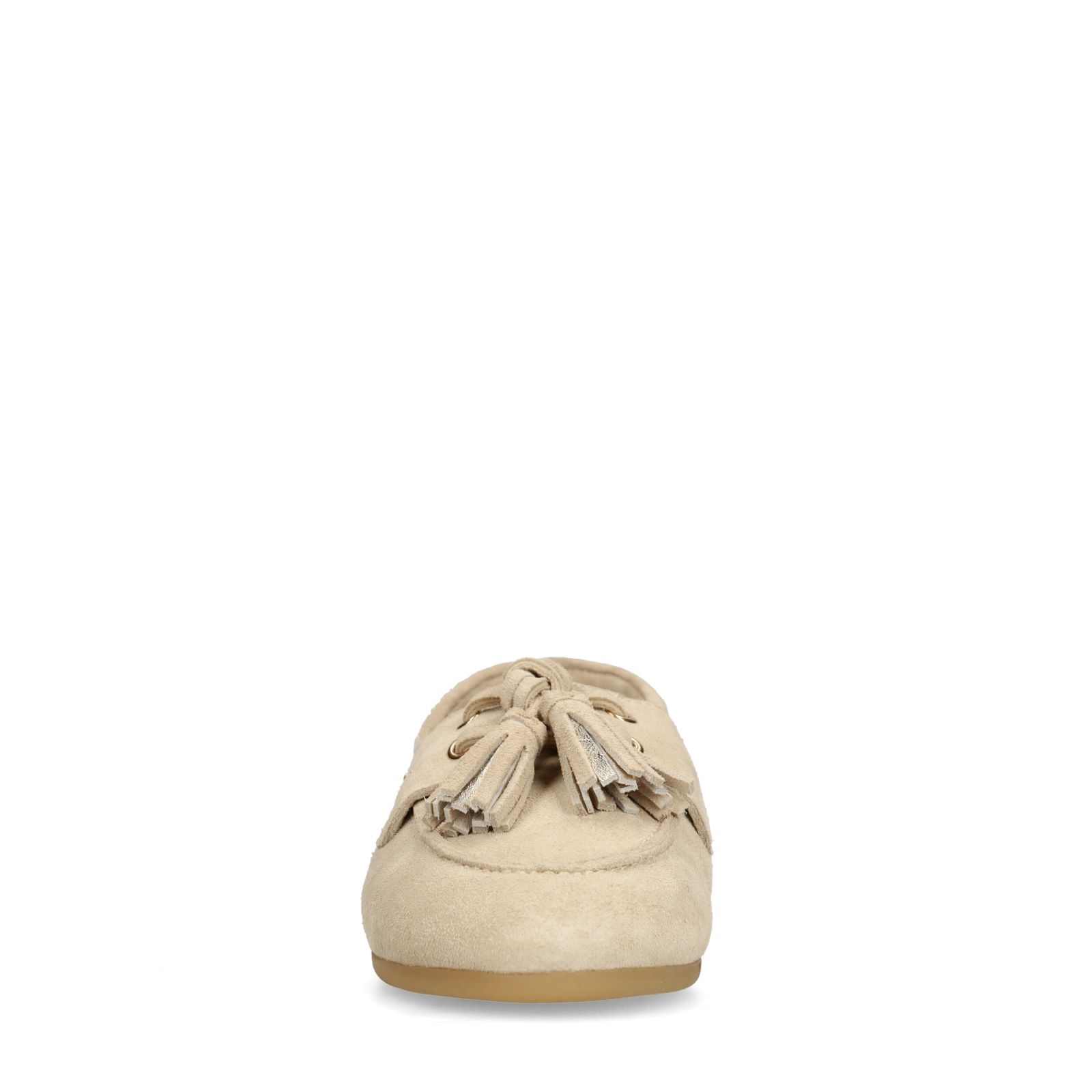 Beige suède loafers met kwastjes van Manfield met gestikte details aan de zijkant. De loafers hebben een rubberen zool van 1 cm en goudkleurige details. We adviseren als verzorging en bescherming de suède/nubuck spray in transparant.