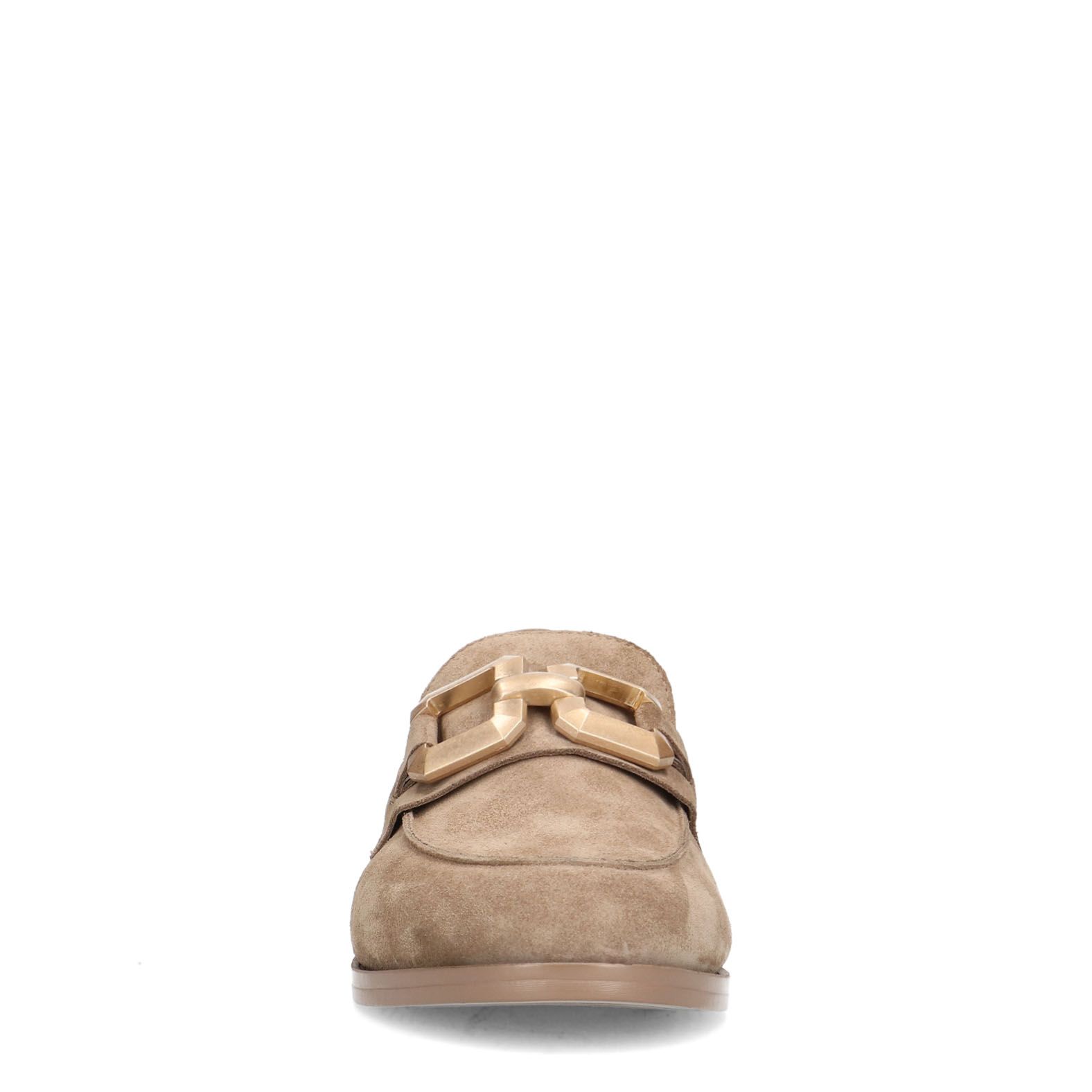 Beige suède loafers met vierkanten chain