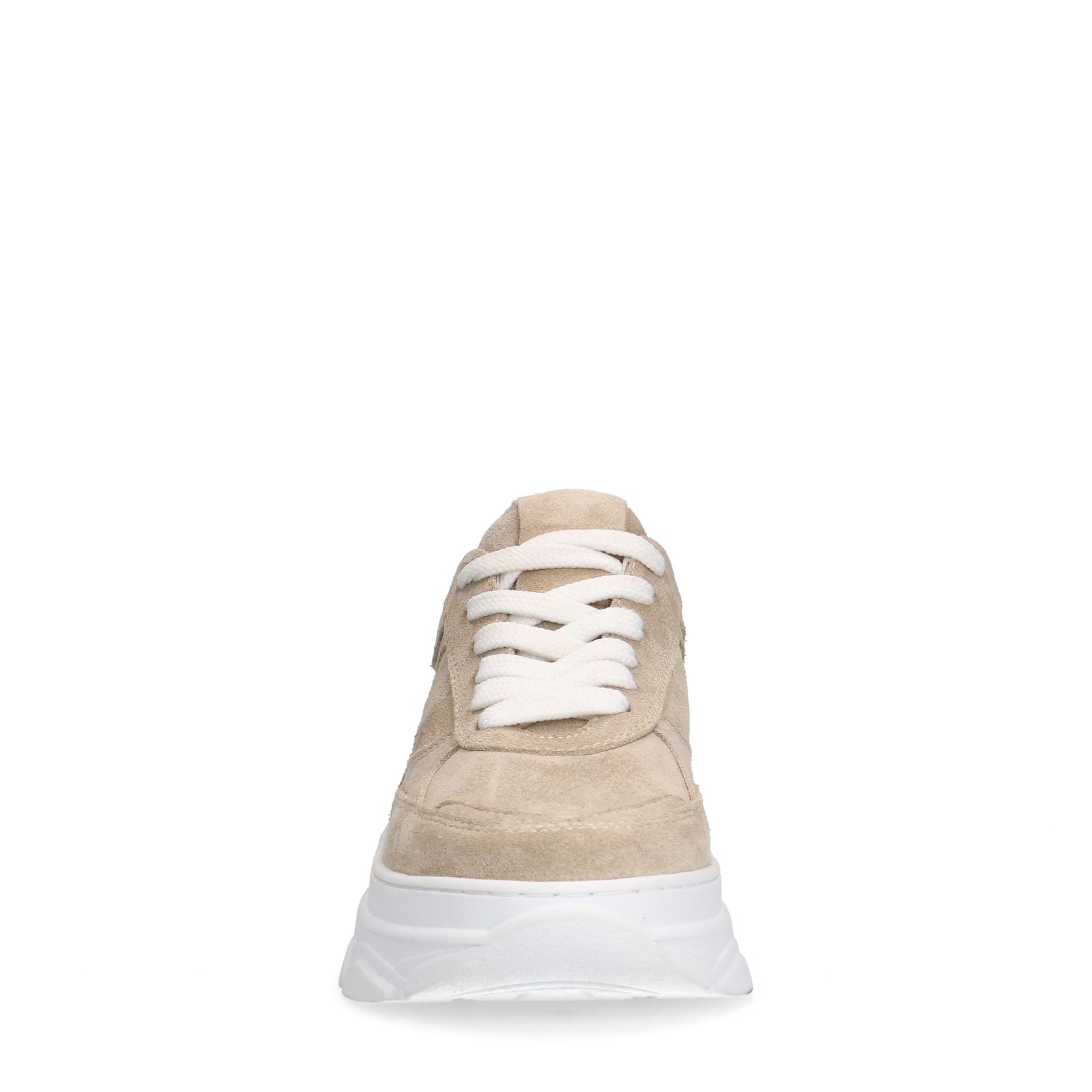 Beige suède sneakers van Manfield met een uitneembare binnenzool en plateau hoogte van 5 cm. We adviseren als verzorging en bescherming de suède/nubuck spray in transparant.
