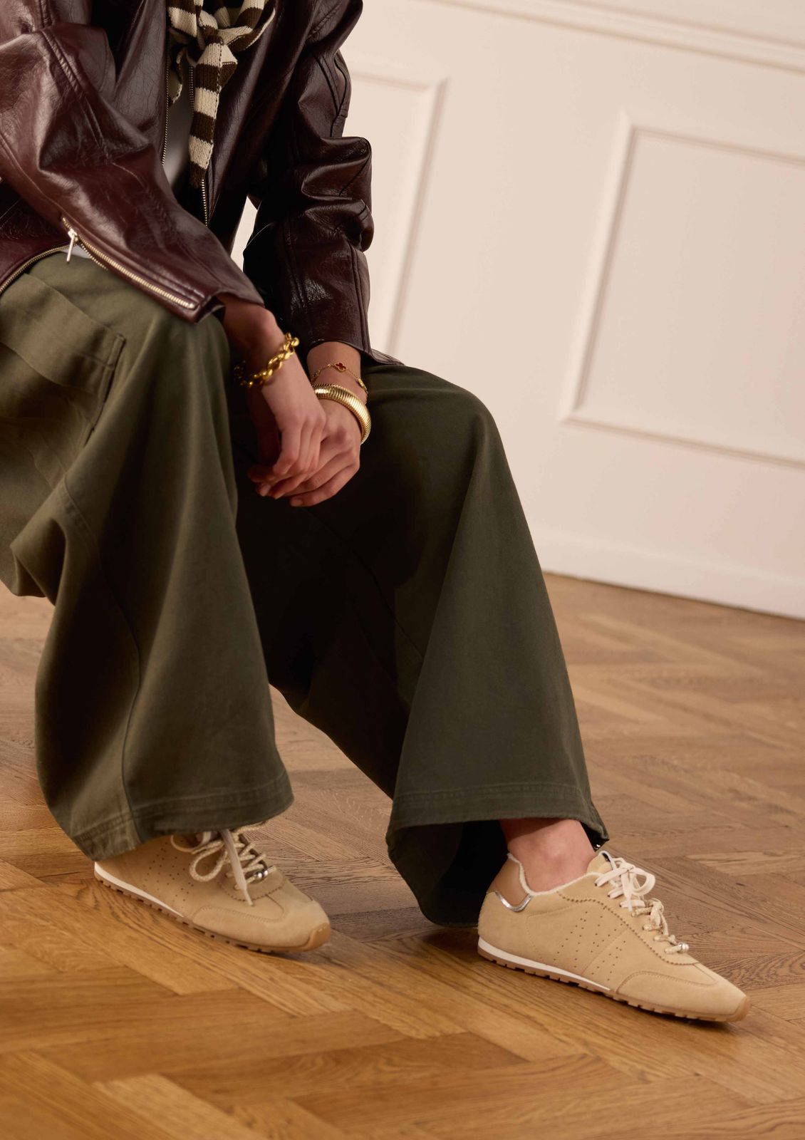 Beige suède sneakers met dubbele vetersluiting van Manfield. De sneakers hebben een rubberen zool van 1 cm, bruin leren detail op de achterzijde en 2 paar gekleurde veters in de schoen zitten die afgewisseld kunnen worden. Ook zit er een extra paar lange veters in de schoenendoos bij. We adviseren als verzorging de suède/nubuck spray in transparant.