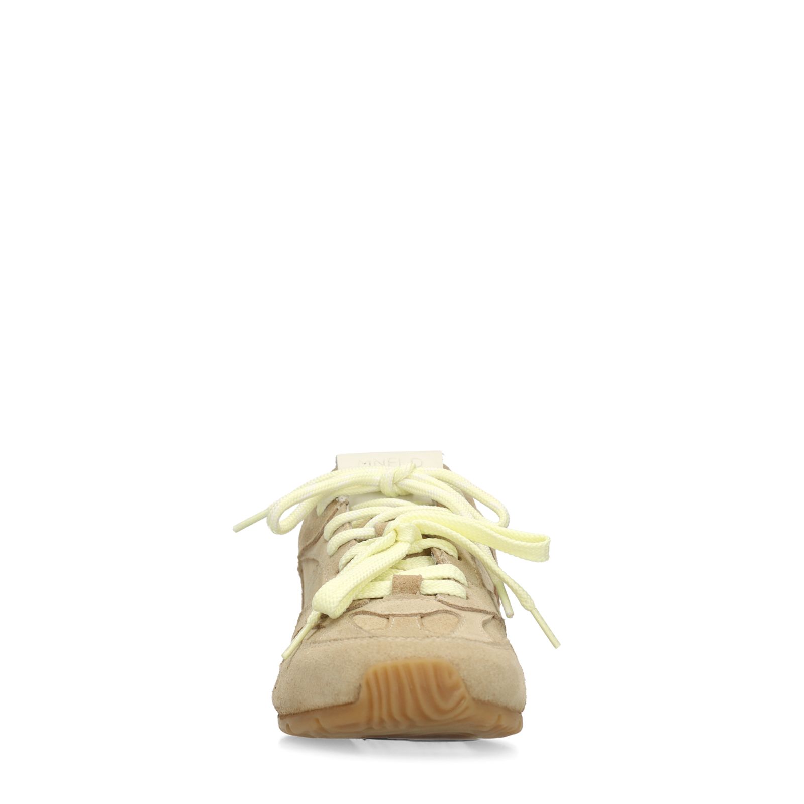 Beige suède sneakers met dubbele vetersluiting van Manfield. De sneakers hebben een rubberen zool van 1 cm, wit leren detail op de achterzijde en 2 paar gekleurde veters in de schoen zitten die afgewisseld kunnen worden. Ook zit er een extra paar lange veters in de schoenendoos bij. We adviseren als verzorging en bescherming de suède/nubuck spray in transparant.