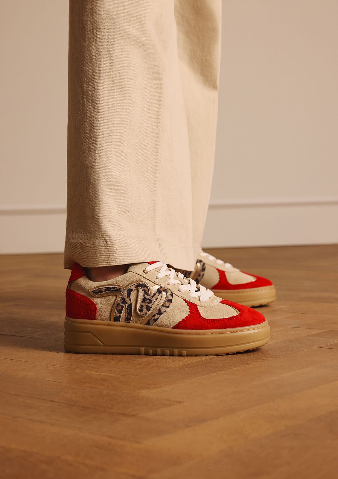 Beige suède sneakers met rode details, witte vetersluiting en een leopard letter M van Manfield. De sneakers hebben een plateauzool van 5 cm. We adviseren als verzorging en bescherming de suède/nubuck spray in transparant.