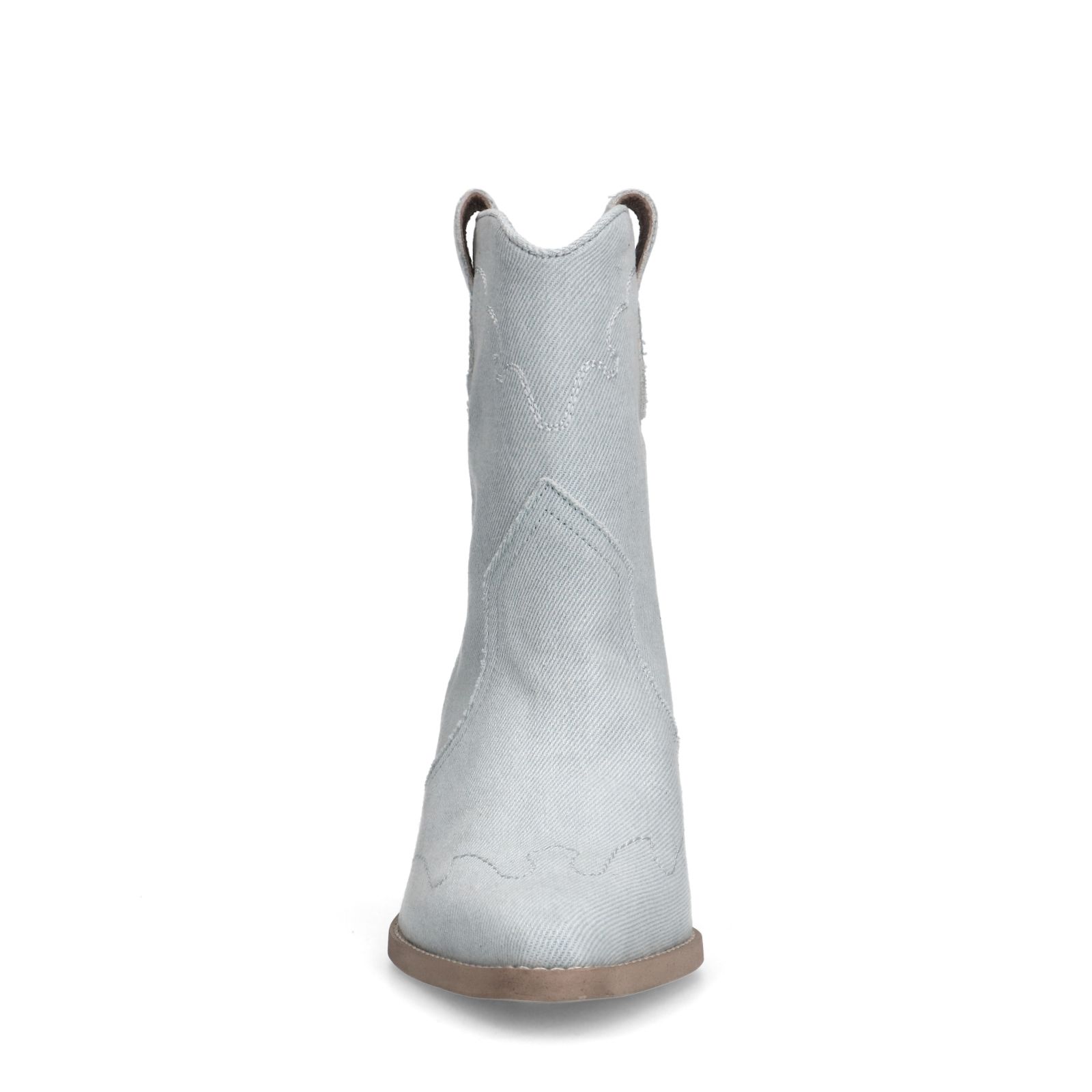 Blauwe denim cowboy laarzen van Manfield met een schuin afgesneden blokhak van 7 cm. De laarzen hebben een puntige neus en ritssluiting aan de binnenzijde. We adviseren als verzorging en bescherming de Natural Trendspray.