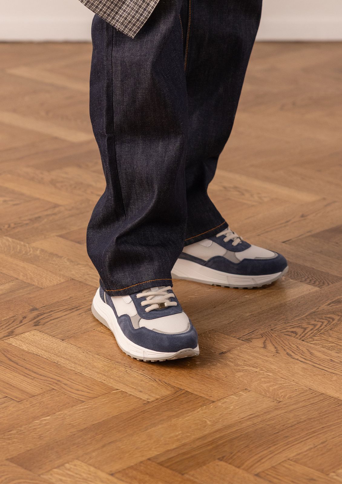 Blauwe suède sneakers met leren details