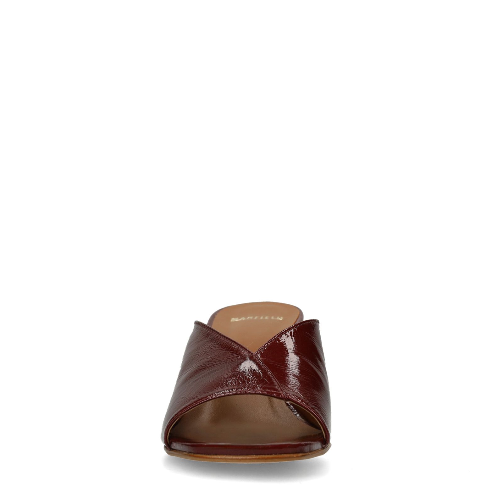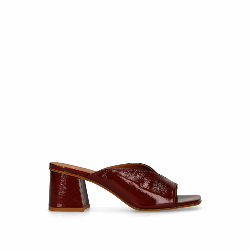 Bordeaux rode lakleren sandalen met hak van Manfield met een blokhak van 6 cm. We adviseren als verzorging en bescherming de Collonil Carbon Pro.