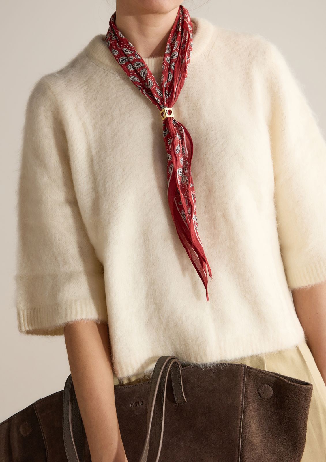 Bordeaux rood sjaaltje van Manfield met zwart-witte details en een ringetje met hartjes vorm waarmee je hem strakker kan aantrekken.
