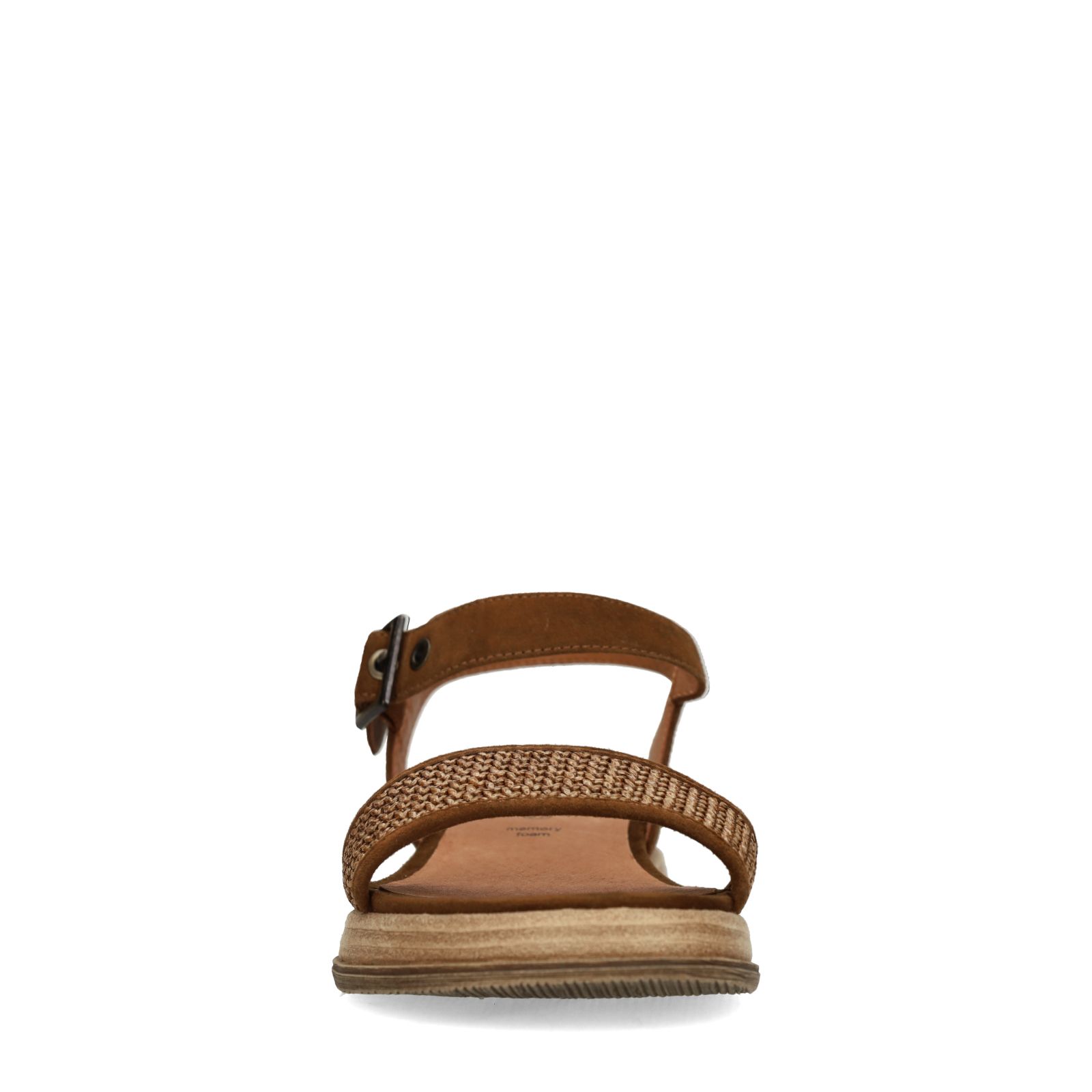 Bruine leren plateau sandalen van het merk No Stress. De sandalen hebben een memory foam voetbed, een gespsluiting en een zool van 3 cm. We adviseren als bescherming en verzorging de Collonil Carbon pro.