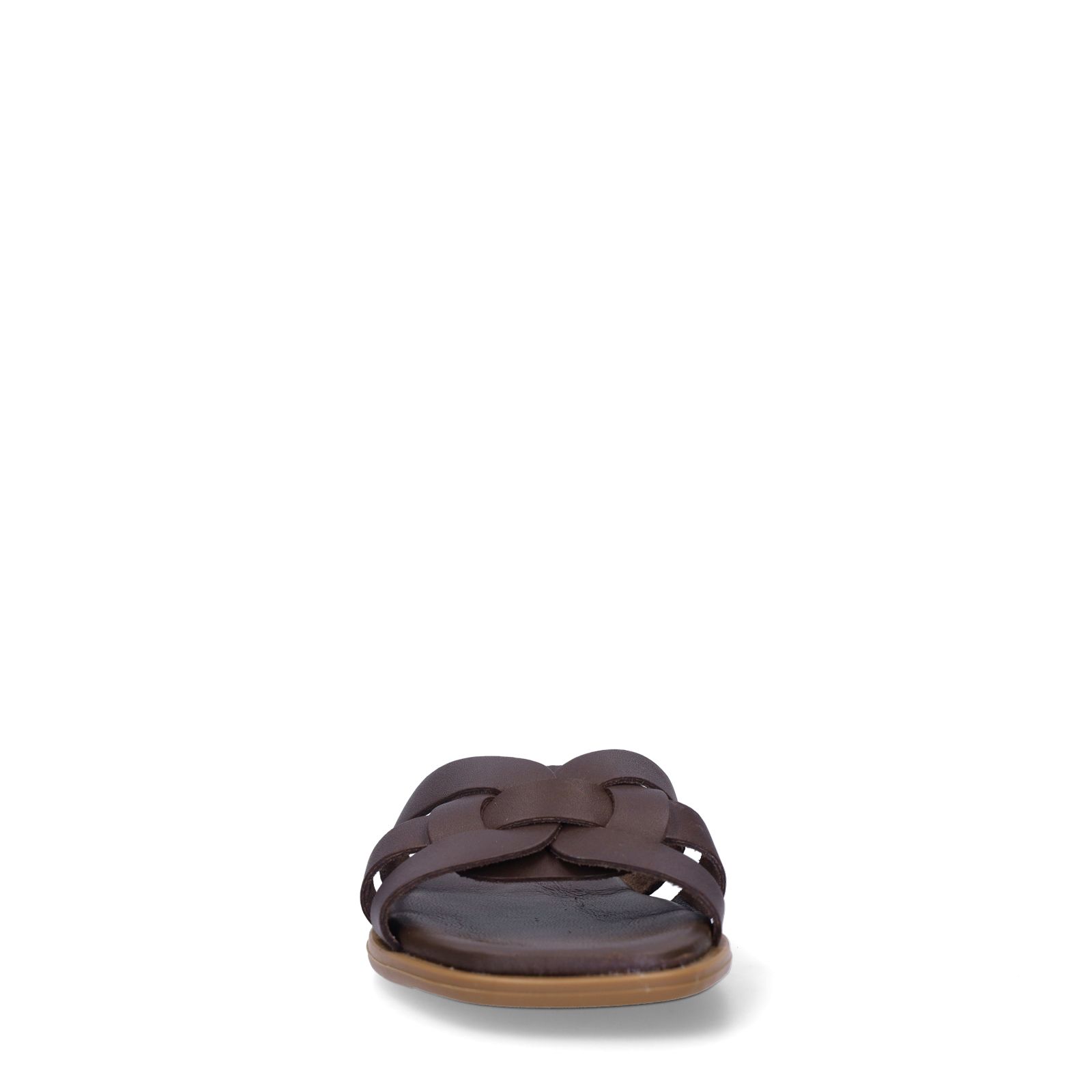 Bruine leren slippers van Manfield met platte hak van 2 cm. We adviseren als verzorging en bescherming de Collonil Carbon Pro.