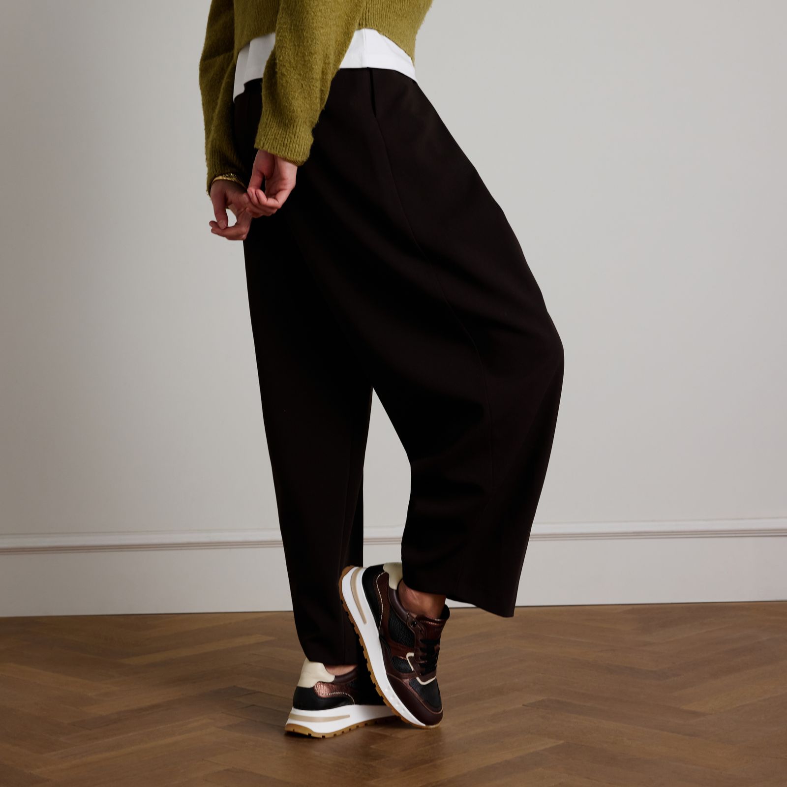 Bruine leren sneakers met metallic details van Manfield. De sneakers hebben een witte zool van 4 cm en we adviseren als bescherming en verzorging de Collonil Carbon Pro.