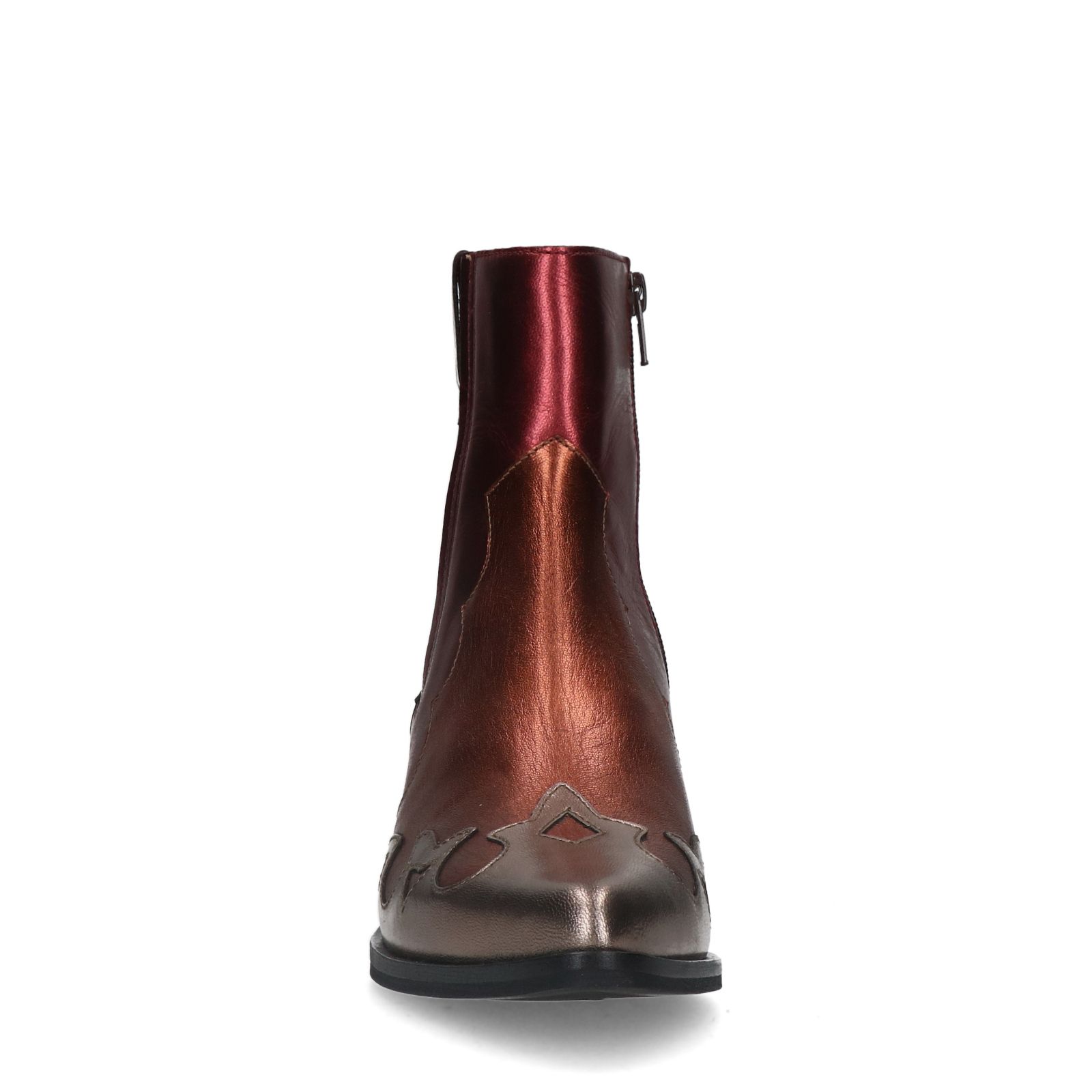 Rode metallic leren cowboy laarzen van Manfield met blokhak van 5 cm en puntige neus. We adviseren als verzorging en bescherming de Collonil Carbon Pro.