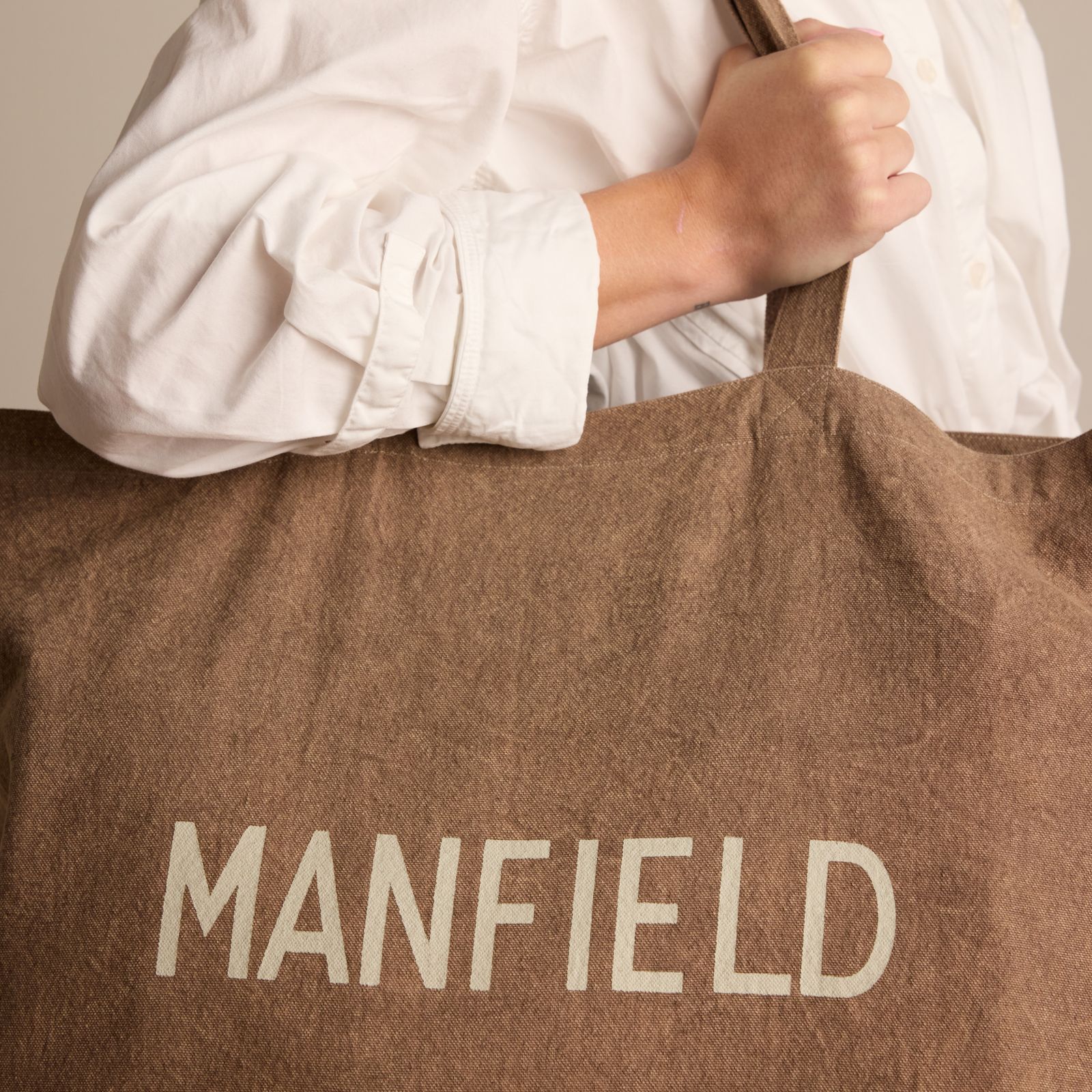 Bruine stoffen shopper van Manfield. De afmeting van deze tas is 51x50x17 cm (BxHxD) en is gemaakt van textiel.