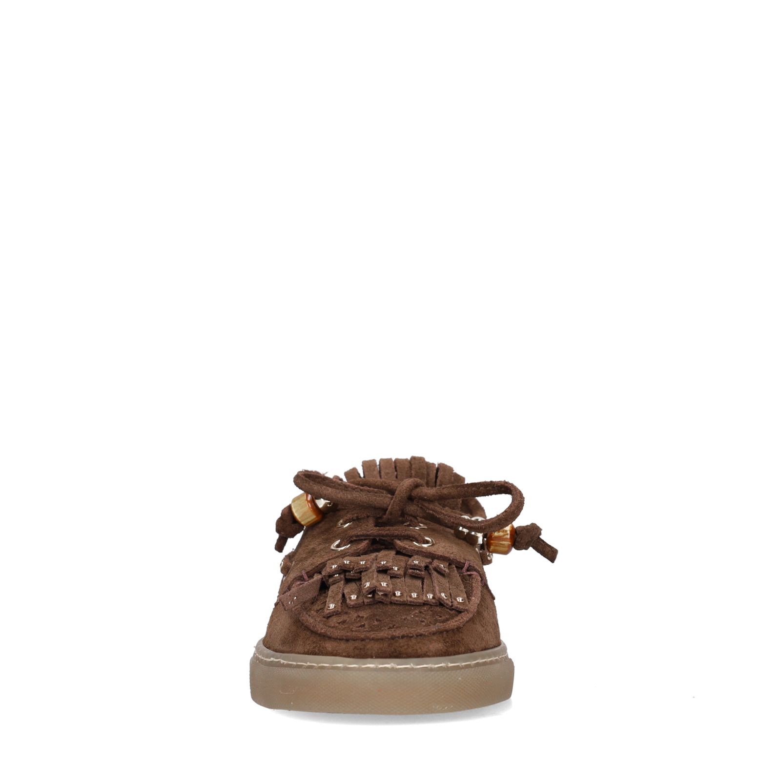 Bruine suède boatloafers met franjes en studs van Manfield. De boatloafers hebben een rubberen zool van 2 cm, veter detail op de voorvoet en aan de zijkant. We adviseren als verzorging en bescherming de suède/nubuck spray in transparant.