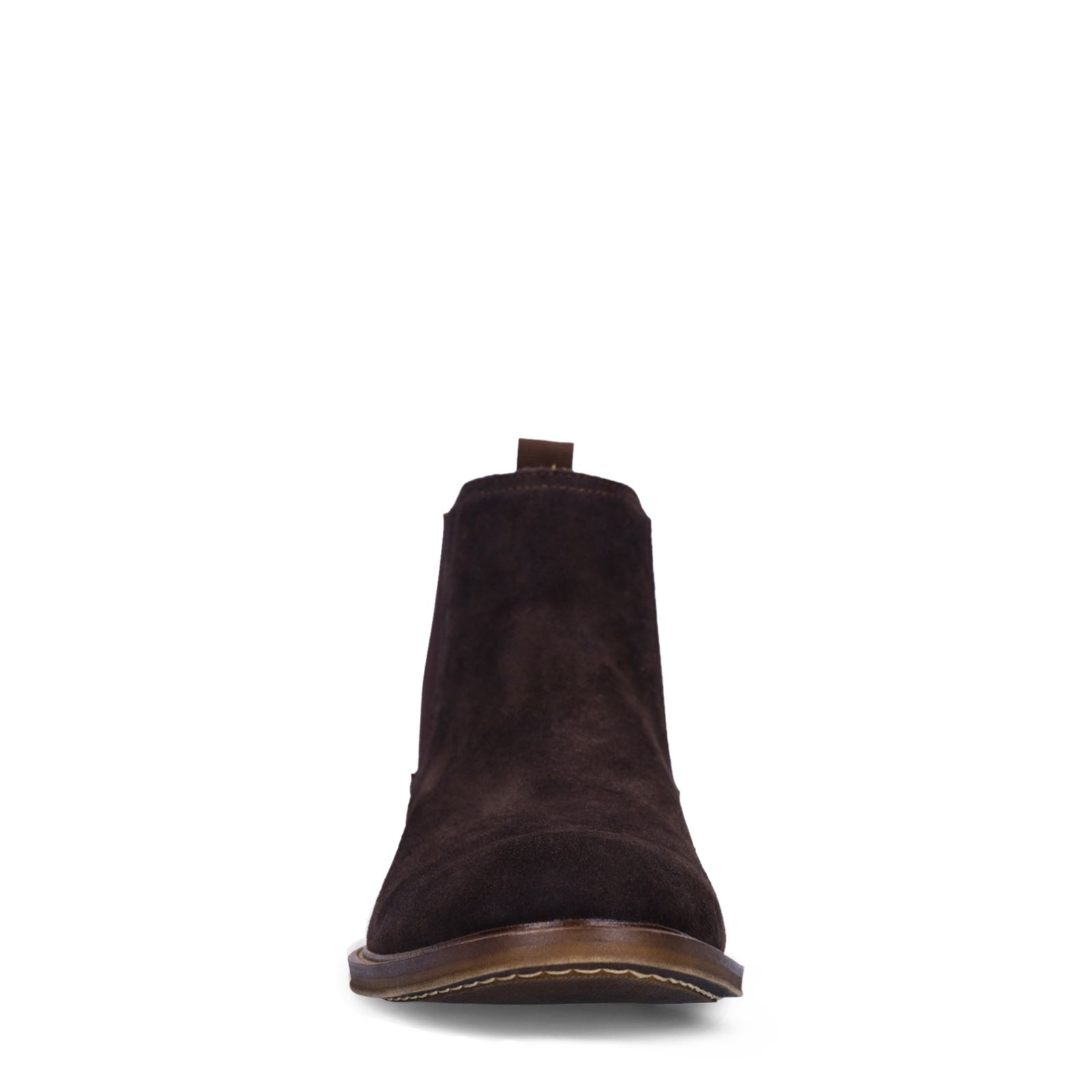 Bruine suède chelseaboots van Manfield met een een platte hak van 3 cm. We adviseren als verzorging en bescherming de suède/nubuck spray in transparant.
