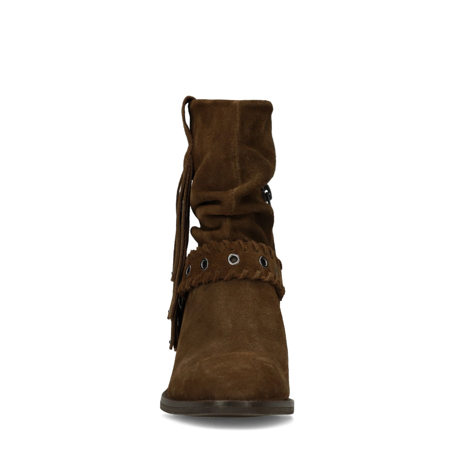 Bruine suède enkellaarsjes met boho details van Manfield. De enkellaarsjes hebben een blokhak van 6 cm, een puntige neus en een gesp detail. We adviseren als verzorging en bescherming de suède/nubuck spray in transparant.