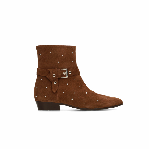 Bruine suède enkellaarsjes met gespdetail van Manfield. De enkellaarsjes hebben een platte hak van 2 cm, een puntige neus en zilverkleurige studs. We adviseren als verzorging en bescherming de suède/nubuck spray in transparant.
