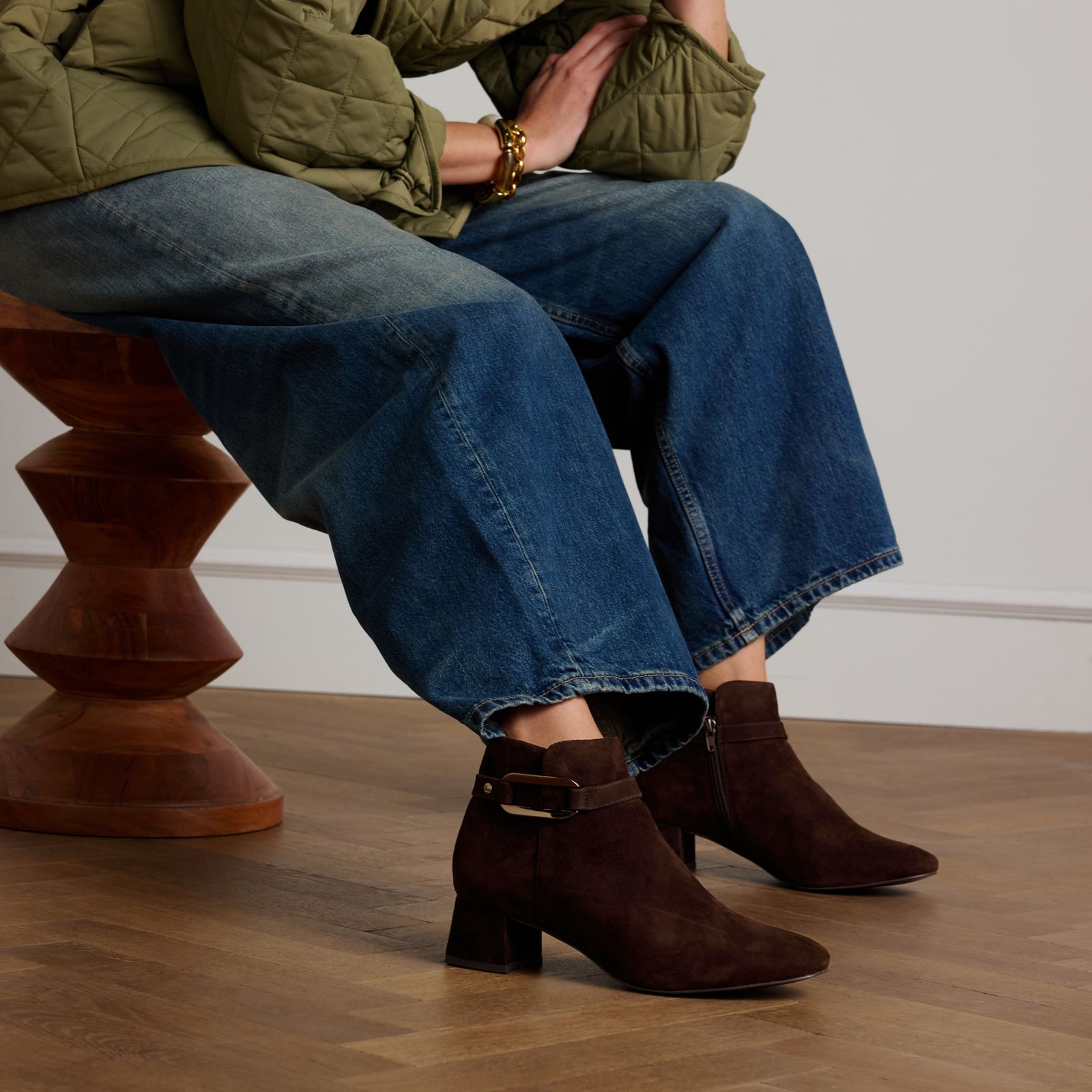 Bruine suède enkellaarsjes met hak van Manfield. De enkellaarsjes hebben een ritssluiting aan de binnenzijde, blokhak van 4 cm en een goudkleurige gesp aan de zijkant. We adviseren als verzorging en bescherming de Natural Trendspray.