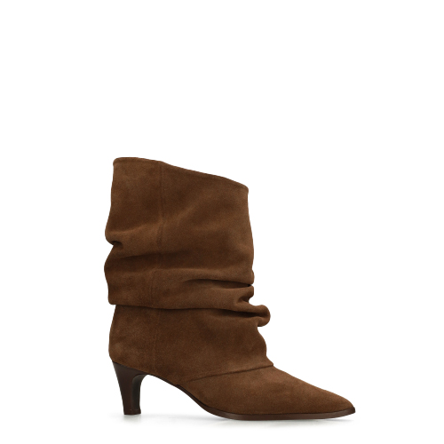 Bruine suède enkellaarsjes met hak van Manfield. De enkellaarsjes hebben een smalle hak van 6 cm, een puntige neus en een afzak design. We adviseren als bescherming en verzorging de suède/ nubuck spray in transparant.