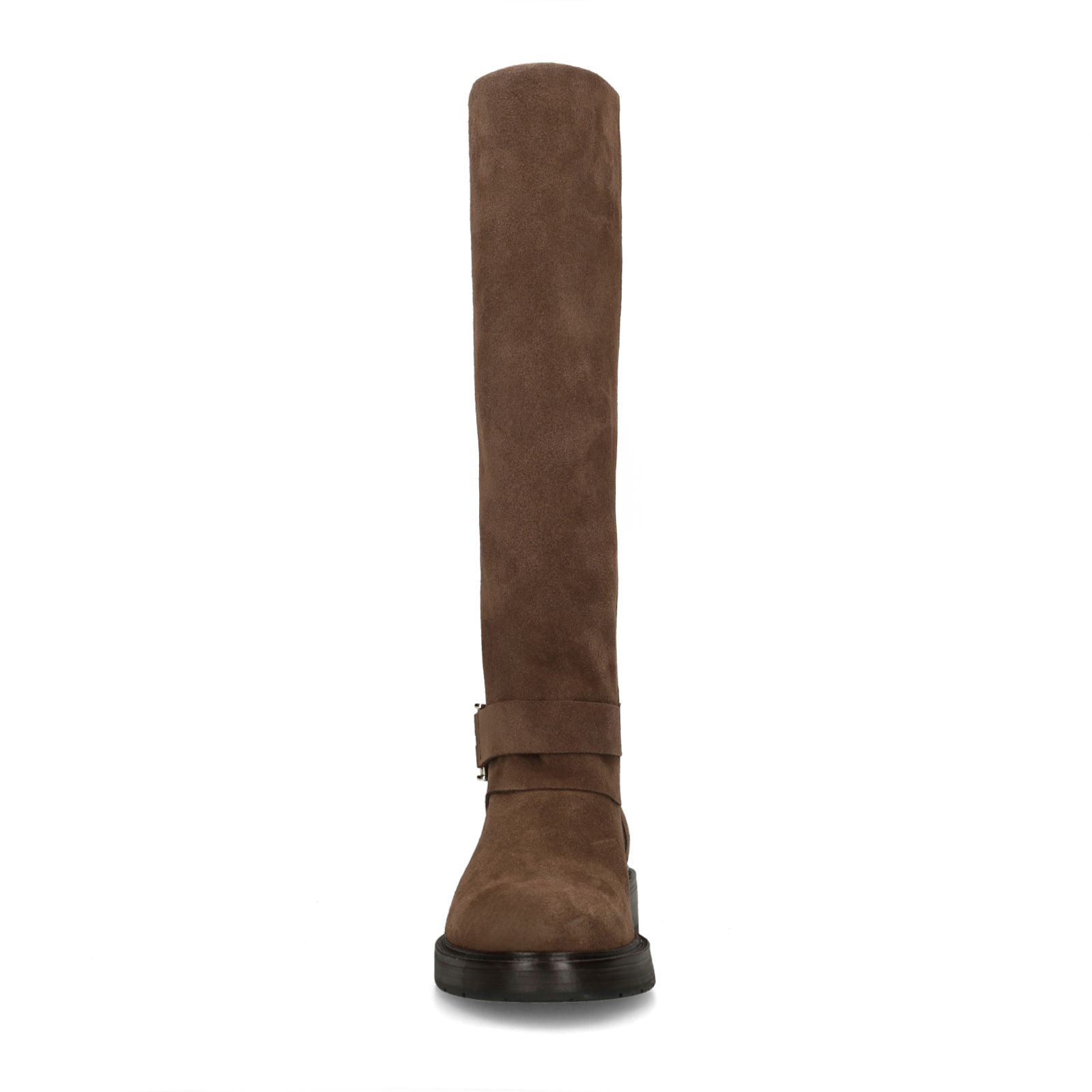 Bruine suède hoge laarzen van Manfield met gesp detail rondom de enkel, ritssluiting aan de binnenzijde en zwarte platte hak van 3 cm. De laarzen hebben een schachthoogte van 40 cm en een schachtbreedte van 39 cm, gemeten bij een maat 37. We adviseren als verzorging en bescherming de suède/nubuck spray in transparant.