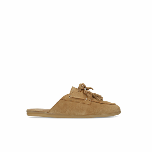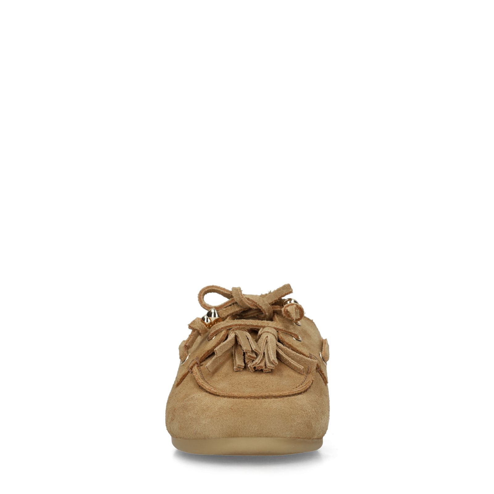Bruine suède instappers van Manfield met franjes en goudkleurige details. De instappers hebben een rubberen zool van 1 cm. We adviseren als verzorging en bescherming de suède/nubuck spray in transparant.