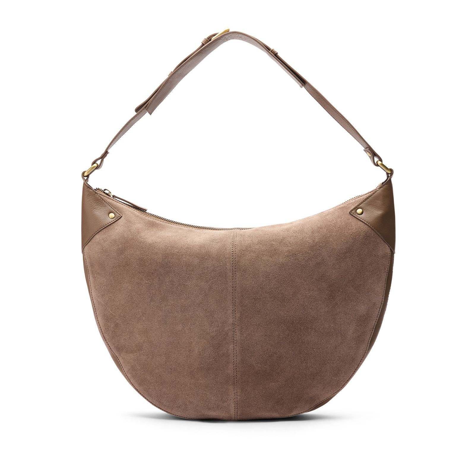 Bruine suède schoudertas van Manfield met leren verstelbare schouderband door middel van een gespsluiting. De tas heeft een rechte ritssluiting en meerdere vakken aan de binnenkant. De afmeting van de tas is 44x30x5 cm, (BxHxD).
