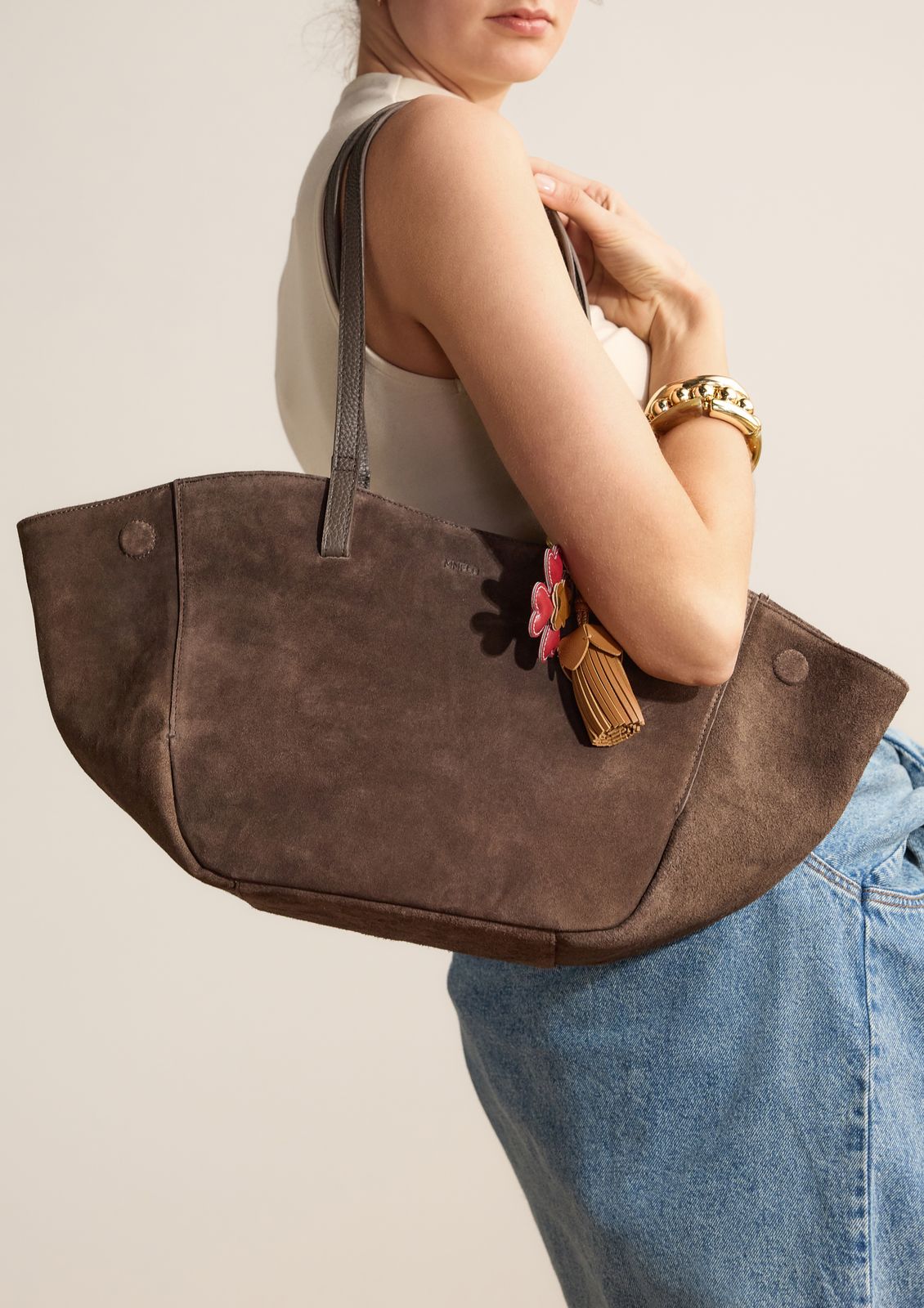 Bruine suède schoudertas van Manfield. De tas heeft een drukknoopsluiting en vakjes aan de binnenzijde. De afmeting van de tas is 50x24x14 cm (BxHxD).