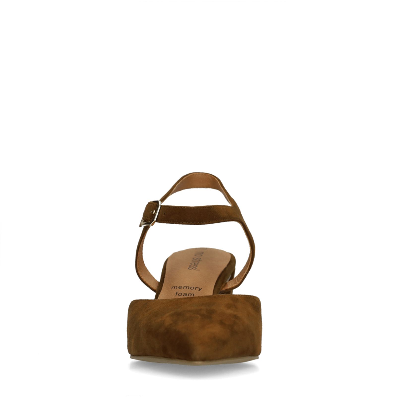 Bruine suède slingbacks van het merk No Stress. De slingbacks hebben een memory foam voetbed, dubbele gespsluiting, puntige neus en blokhak van 6 cm. We adviseren als verzorging en bescherming de suède/nubuck spray in transparant.
