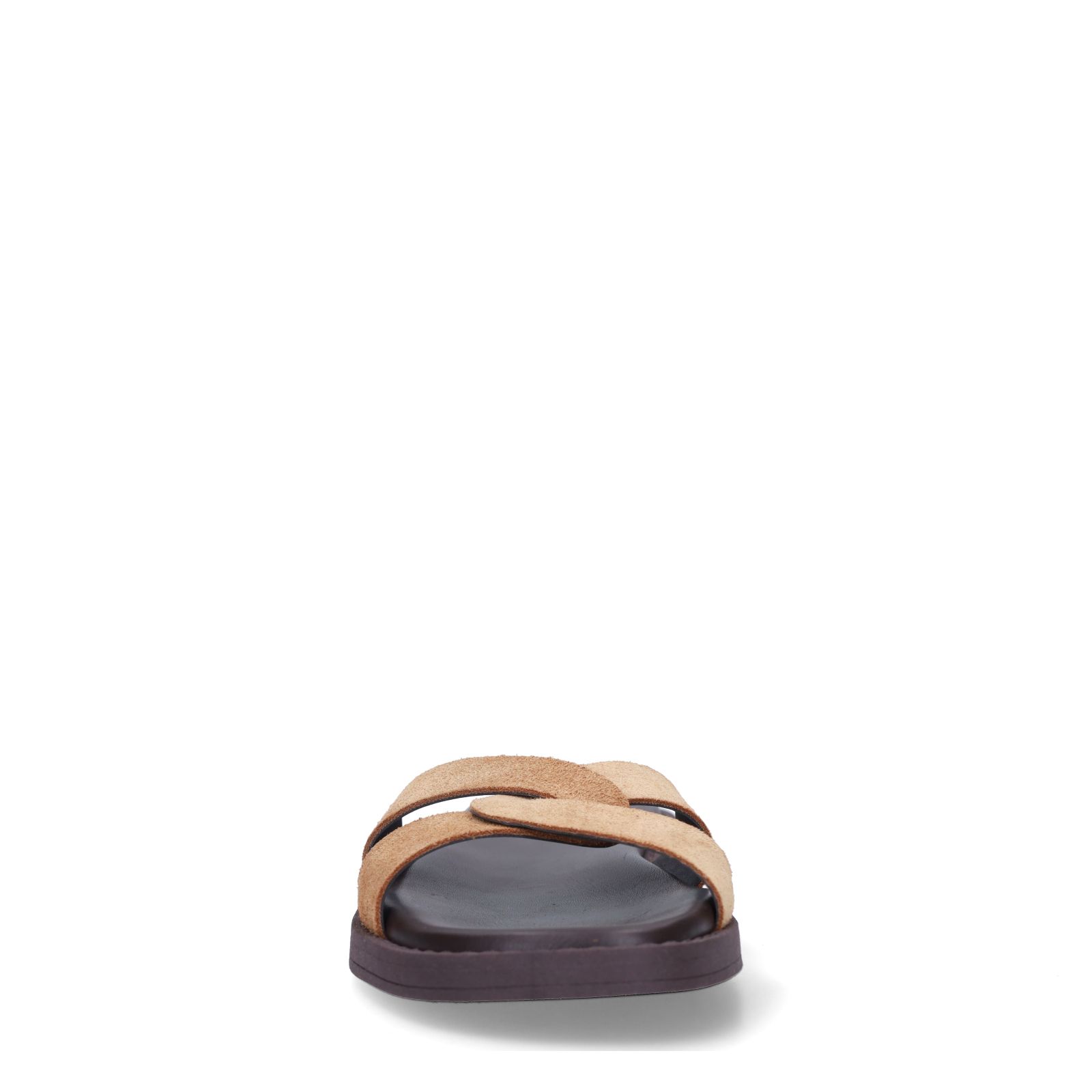 Bruine suède slippers van Manfield met een zool van 1 cm en een gekruiste band op de voorvoet. We adviseren als verzorging en bescherming de suède/nubuck spray in transparant.