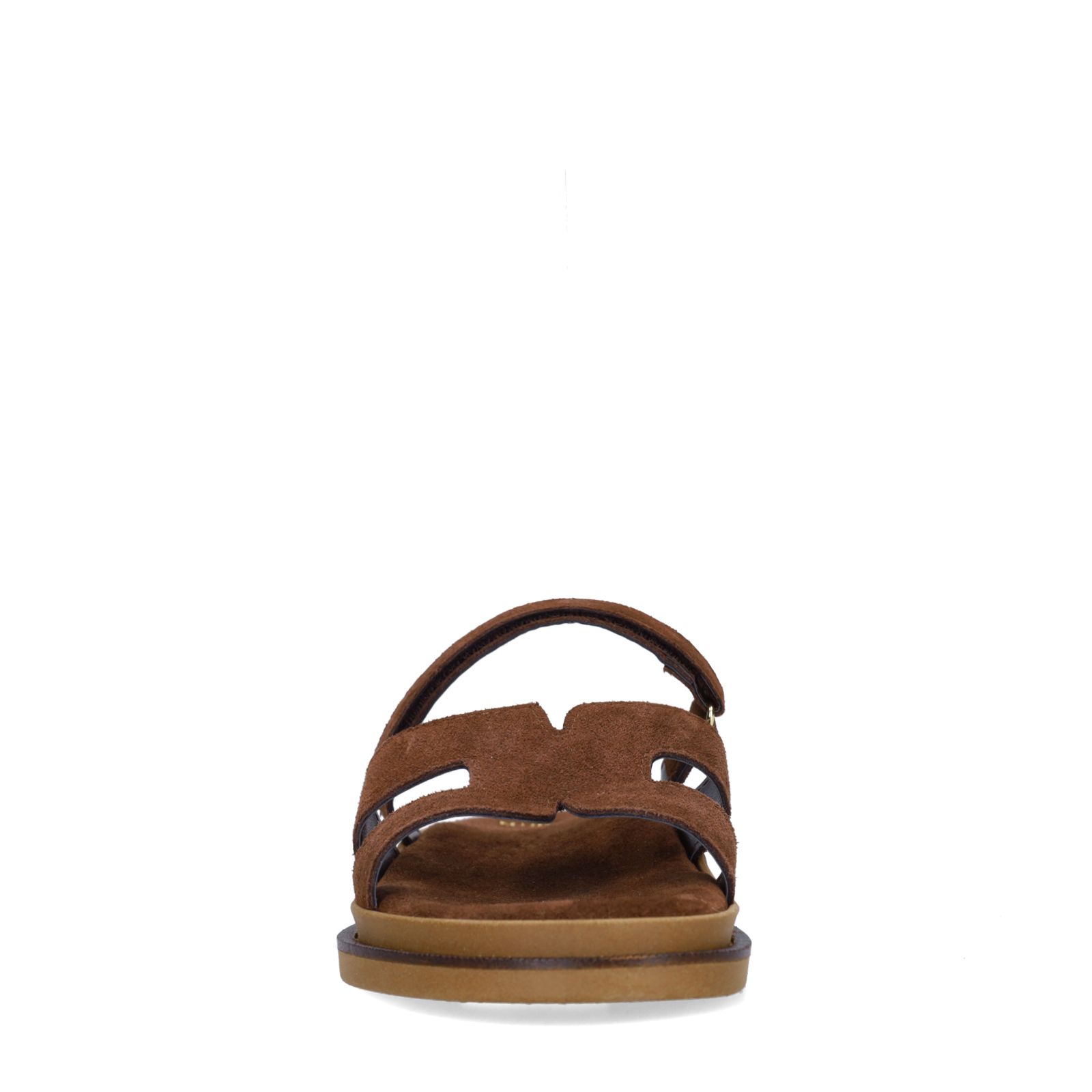 Bruine suède slippers met bandje van Manfield. De slippers hebben een plateauzool van 3 cm en klittenband sluiting. We adviseren als verzorging en bescherming de suède/nubuck spray in transparant.