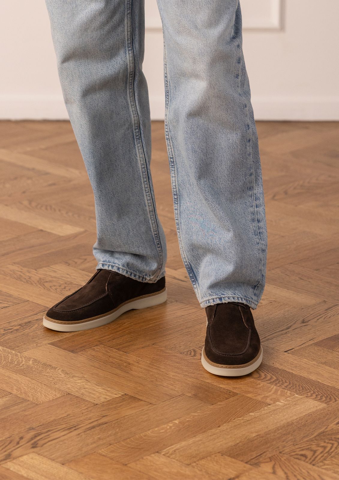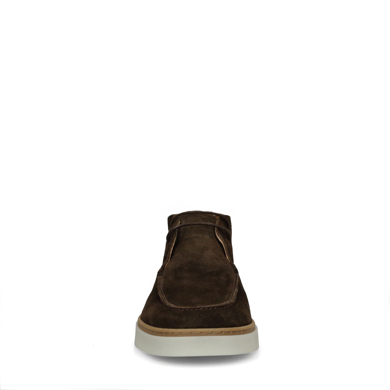 Bruine suède veterschoenen van Manfield met witte zool van 3 cm. We adviseren als verzorging en bescherming de suède/nubuck spray in transparant.