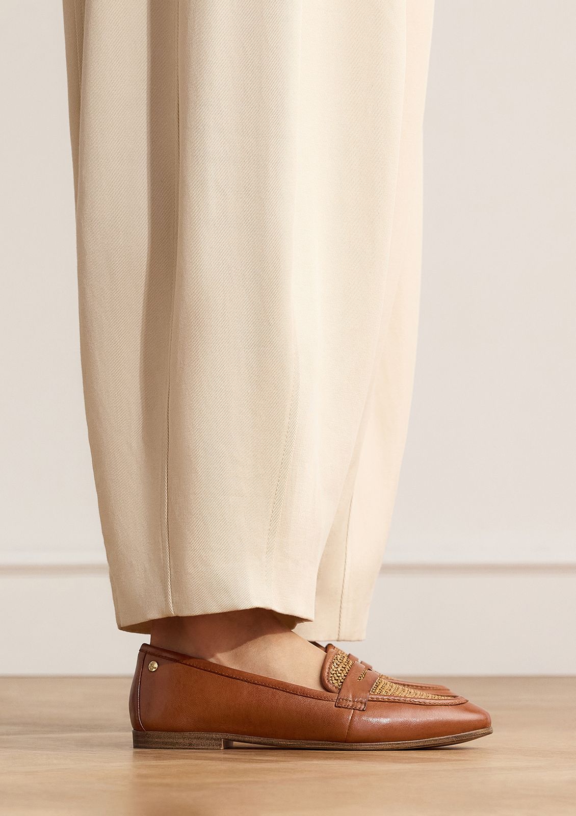 Cognac leren loafers met gevlochten raffia details van No Stress. de loafers hebben een lage hak van 1 cm en memory foam voetbed. We adviseren als verzorging en bescherming de Collonil Carbon Pro.