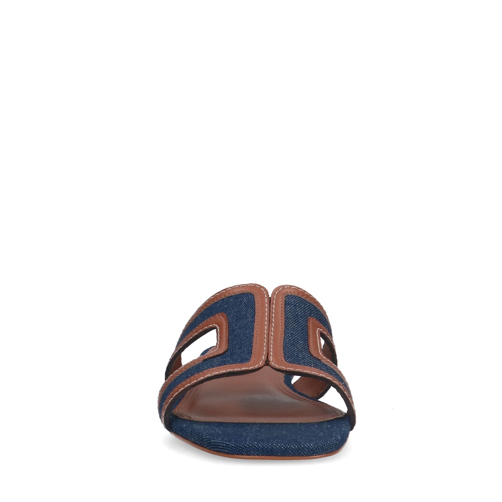 Denim slippers van Manfield met een leren afwerking en een platte hak van 1 cm. We adviseren als verzorging en bescherming de Natural Trendspray.