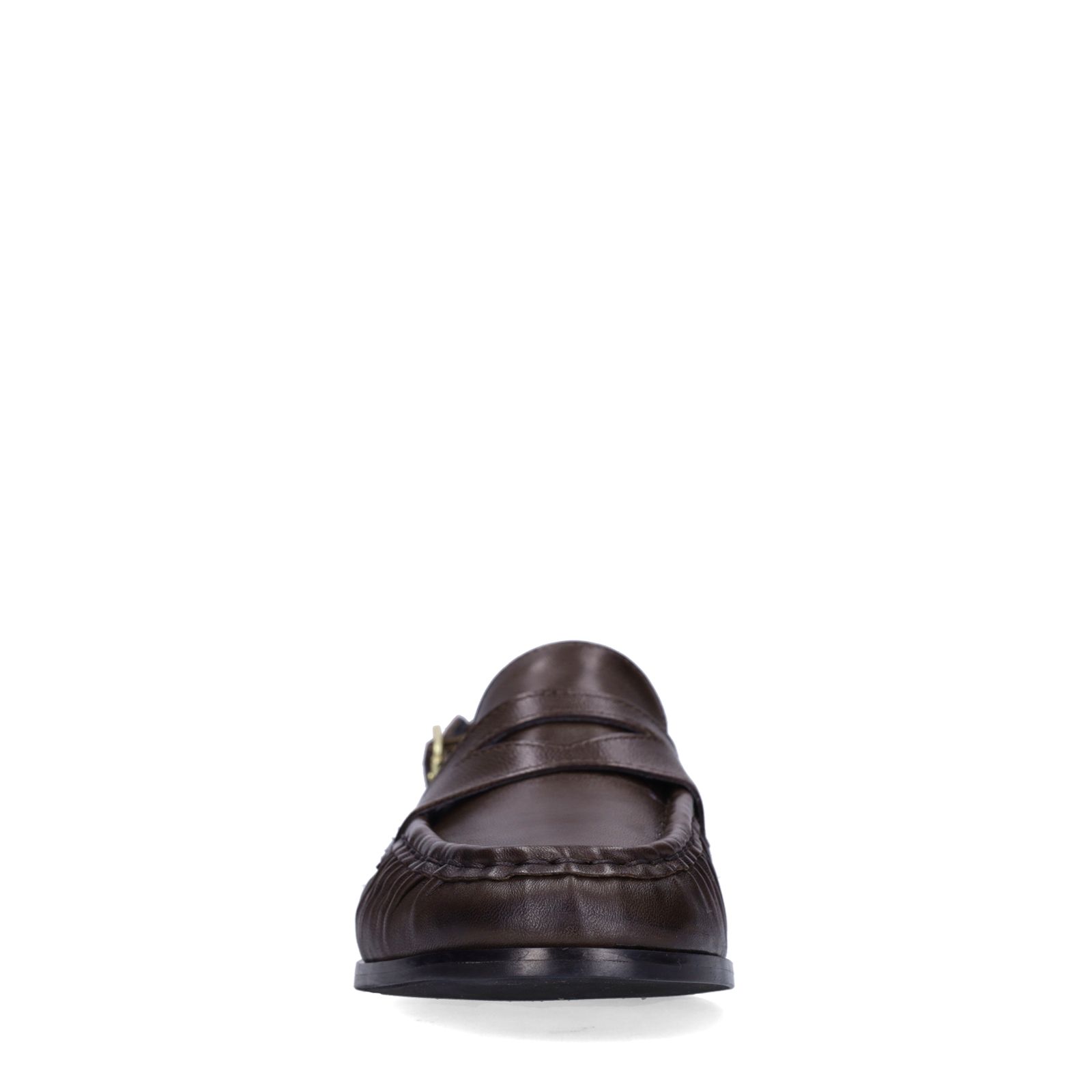 Donkerbruine leren slingback loafers van Manfield. De loafers hebben een platte zwarte hak van 2 cm, gouden gespdetail rondom de enkel en stiksel details op de voorvoet. We adviseren als verzorging en bescherming de Collonil Carbon Pro.