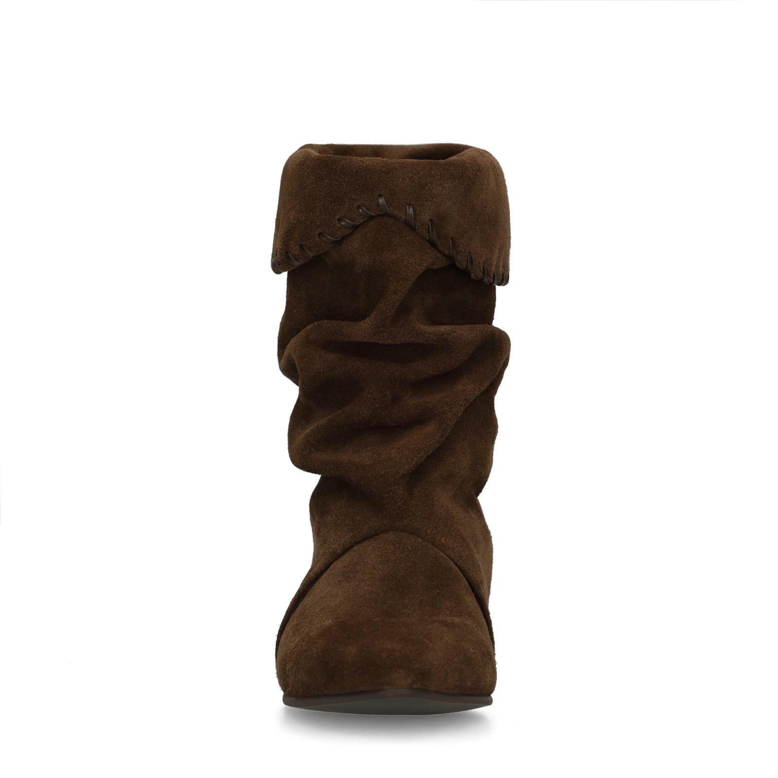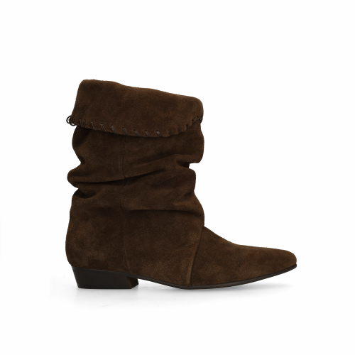 Donkerbruine suède enkellaarsjes van Manfield met een platte hak van 3 cm. De enkellaarsjes hebben een puntige neus en een afzak effect. De laarzen hebben een schachthoogte van 23 cm en een schachtomtrek van 40 cm, gemeten bij een maat 37. We adviseren als bescherming en verzorging de suède/ nubuck spray in transparant.