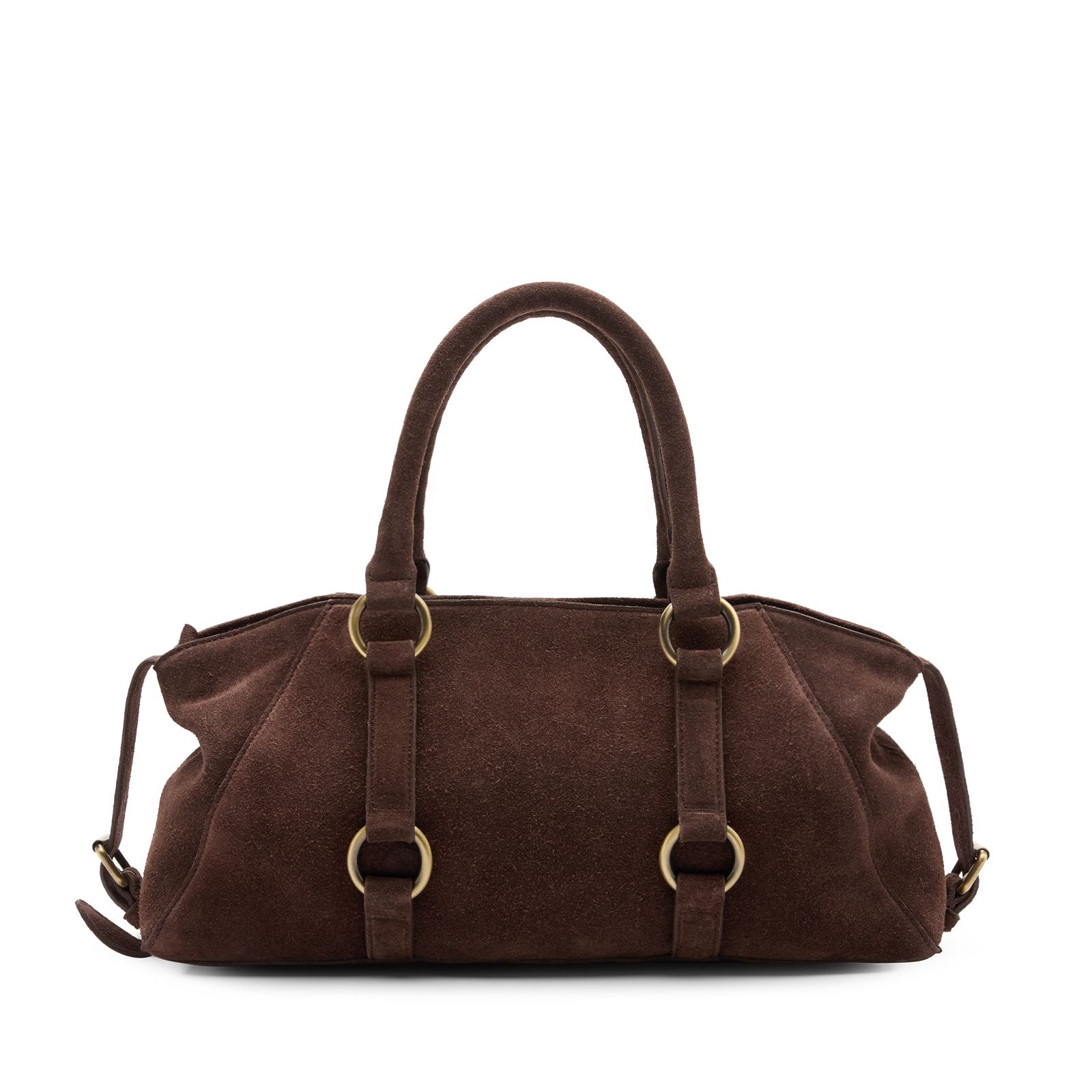 Donkerbruine suède handtas met gouden ringen