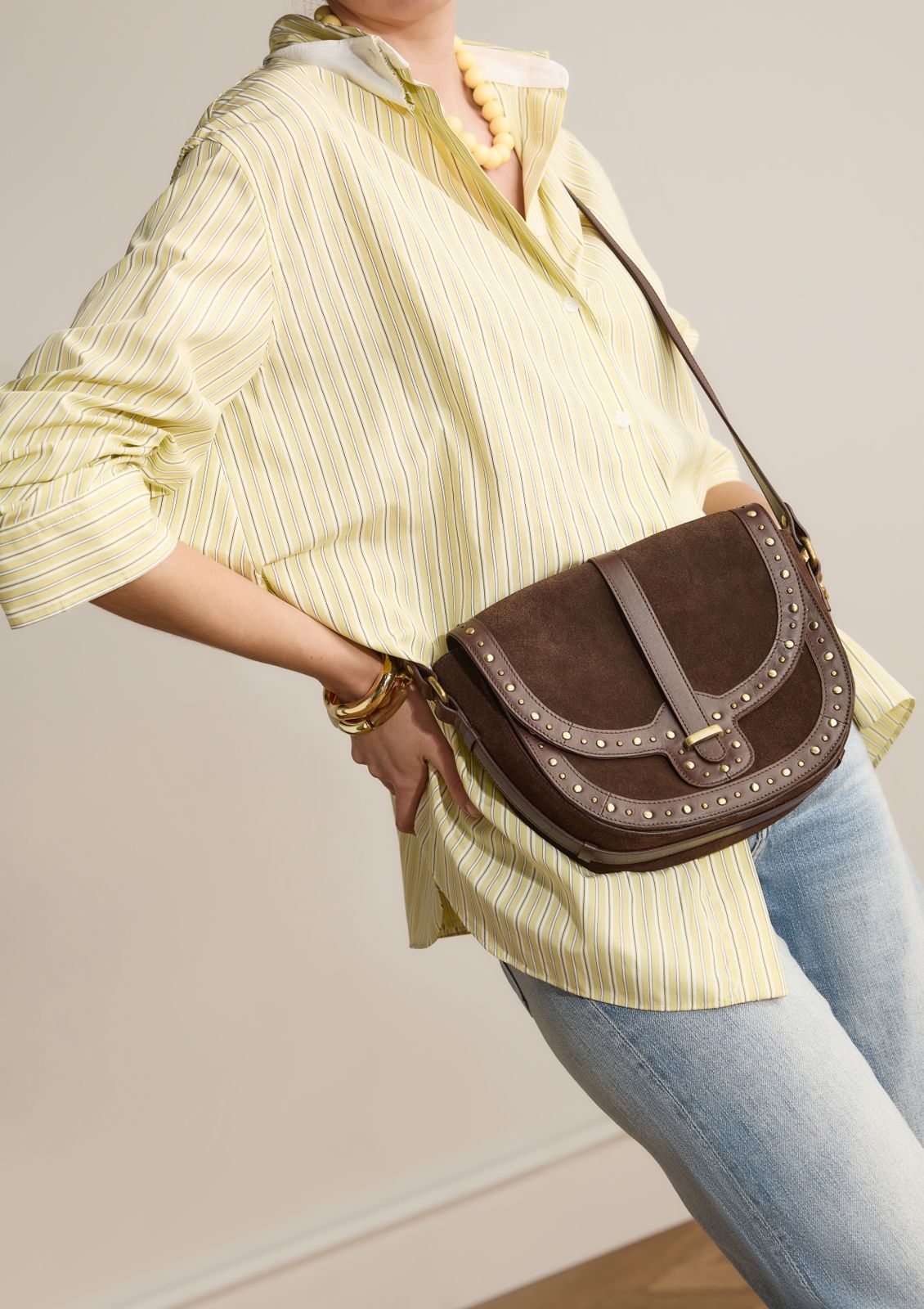 Donkerbruine suède schoudertas met gouden studs van Manfield. De tas heeft een drukknoopsluiting, meerdere vakken aan de binnenzijde en een verstelbare schouderband van 110 cm. De afmeting van de tas is is 23x22x8 cm, (BxHxD).