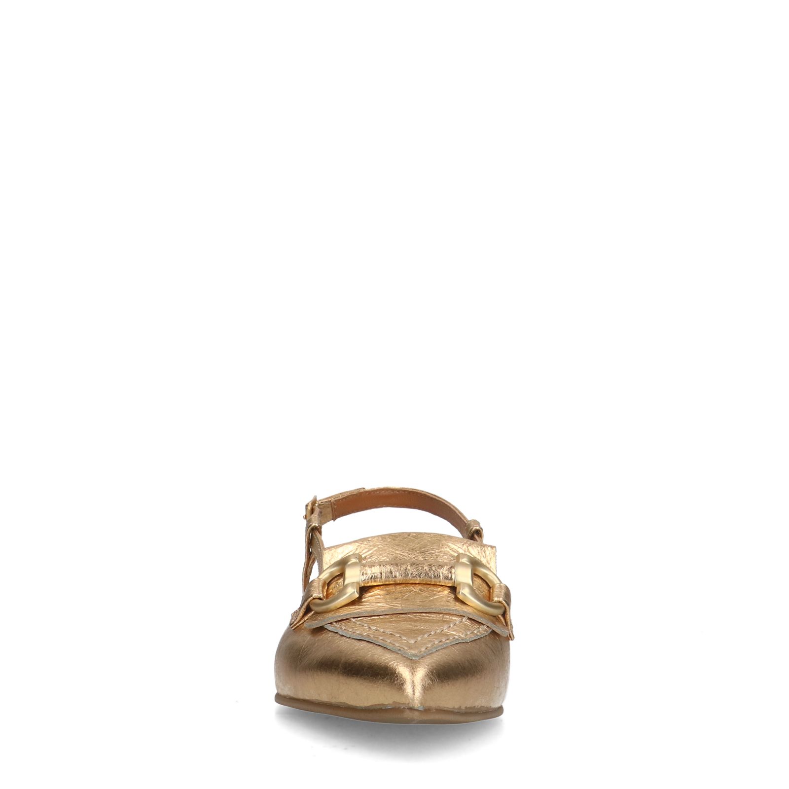 Goudkleurige leren slingbacks van Manfield met gespsluiting, goudkleurig detail op de voorvoet en een platte blokhak van 3 cm. We adviseren als verzorging en bescherming de Collonil metallic spray.